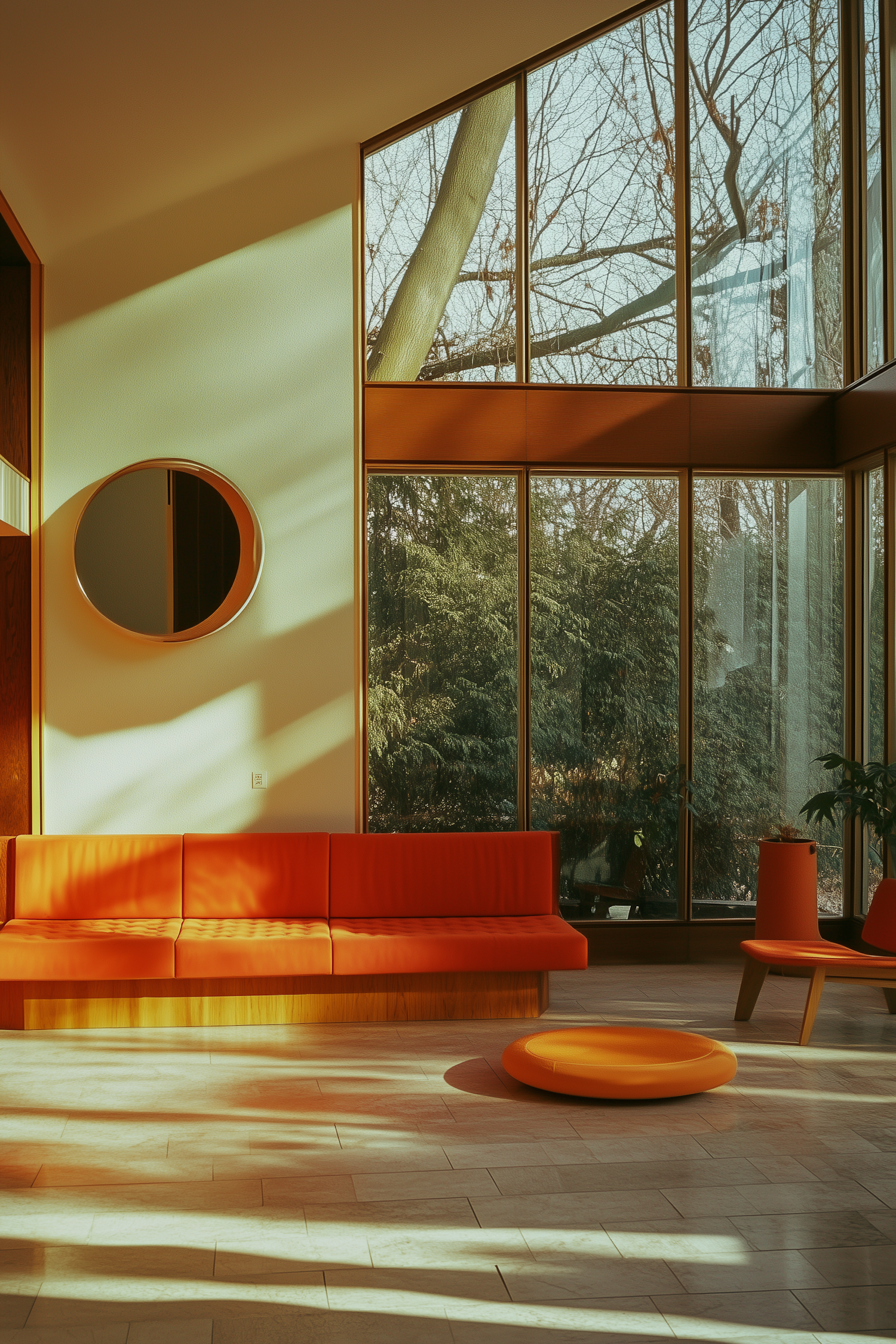 Modern living room with orange sofa, large windows, and warm sunlight casting shadows on the floor. Minimalist and inviting design.