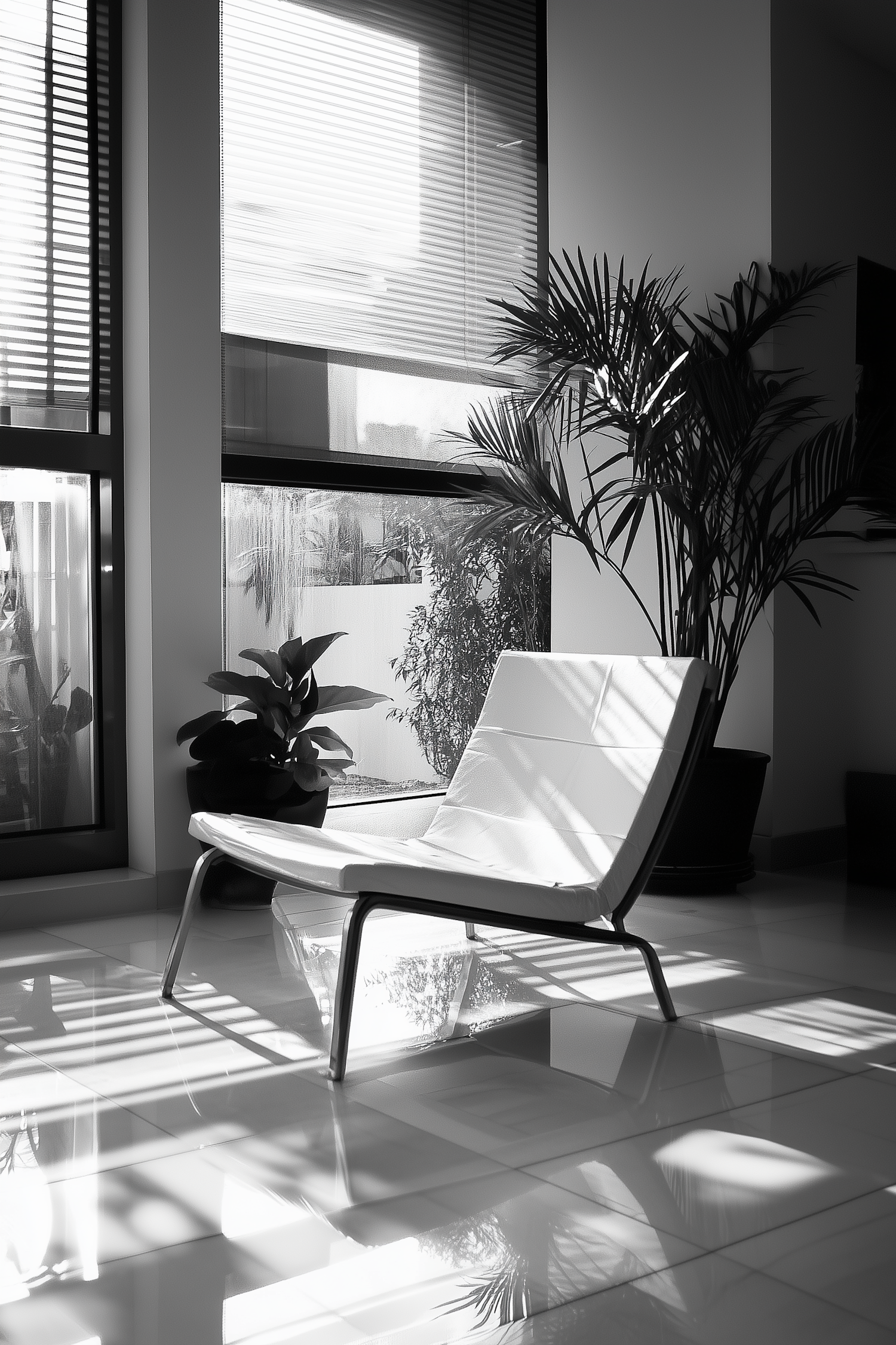 Modern minimalist interior with a white chair, large windows, and lush plants. Sunlight creates striking shadows on the glossy floor.