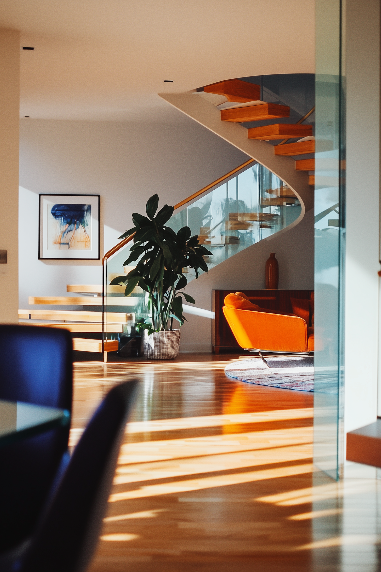 Modern interior with a curved wooden staircase, glass railings, orange armchair, and abstract art. Sunlit space with a potted plant.