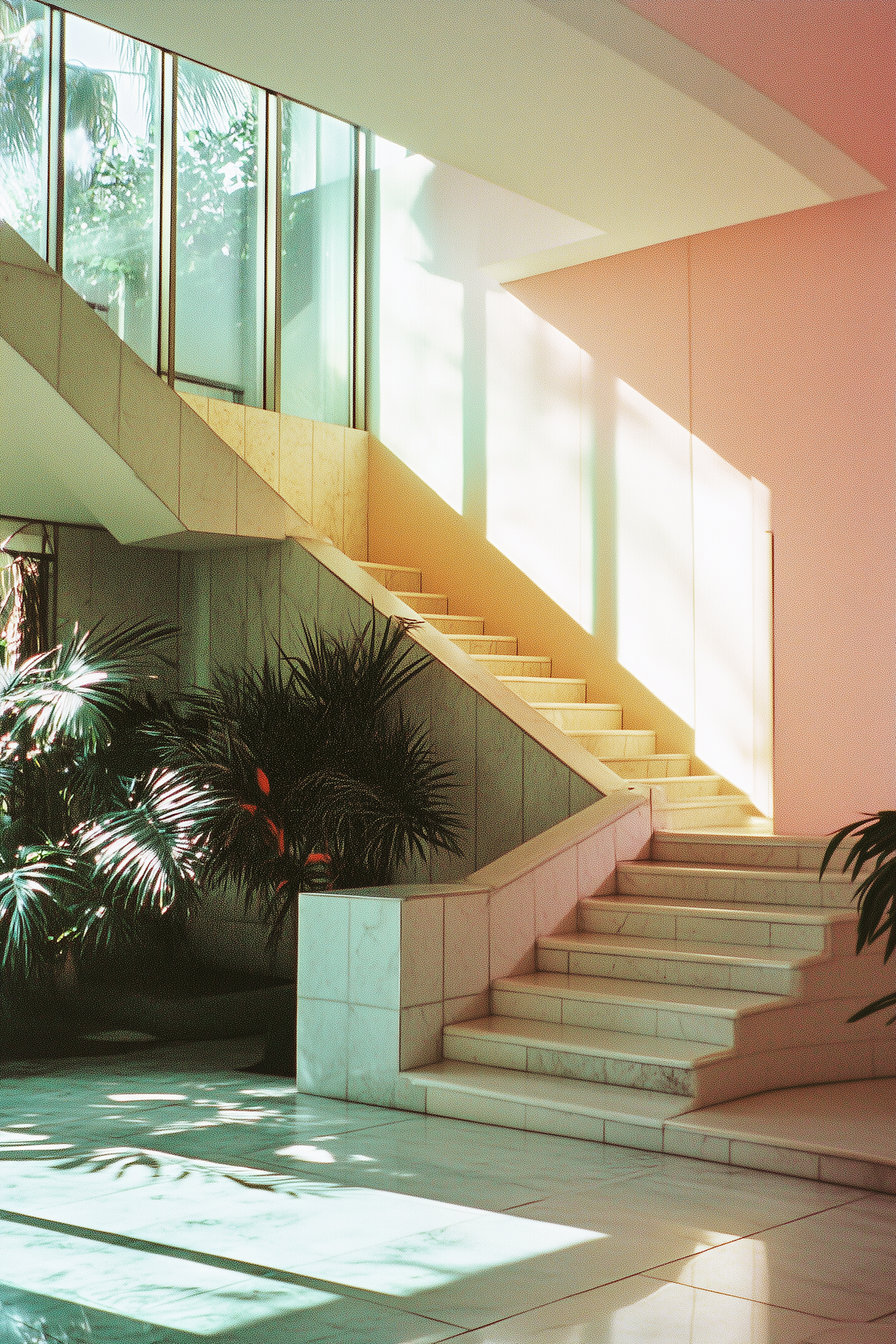 Elegant marble staircase with pastel walls and lush plants, bathed in natural light from large windows. Modern and serene interior design.