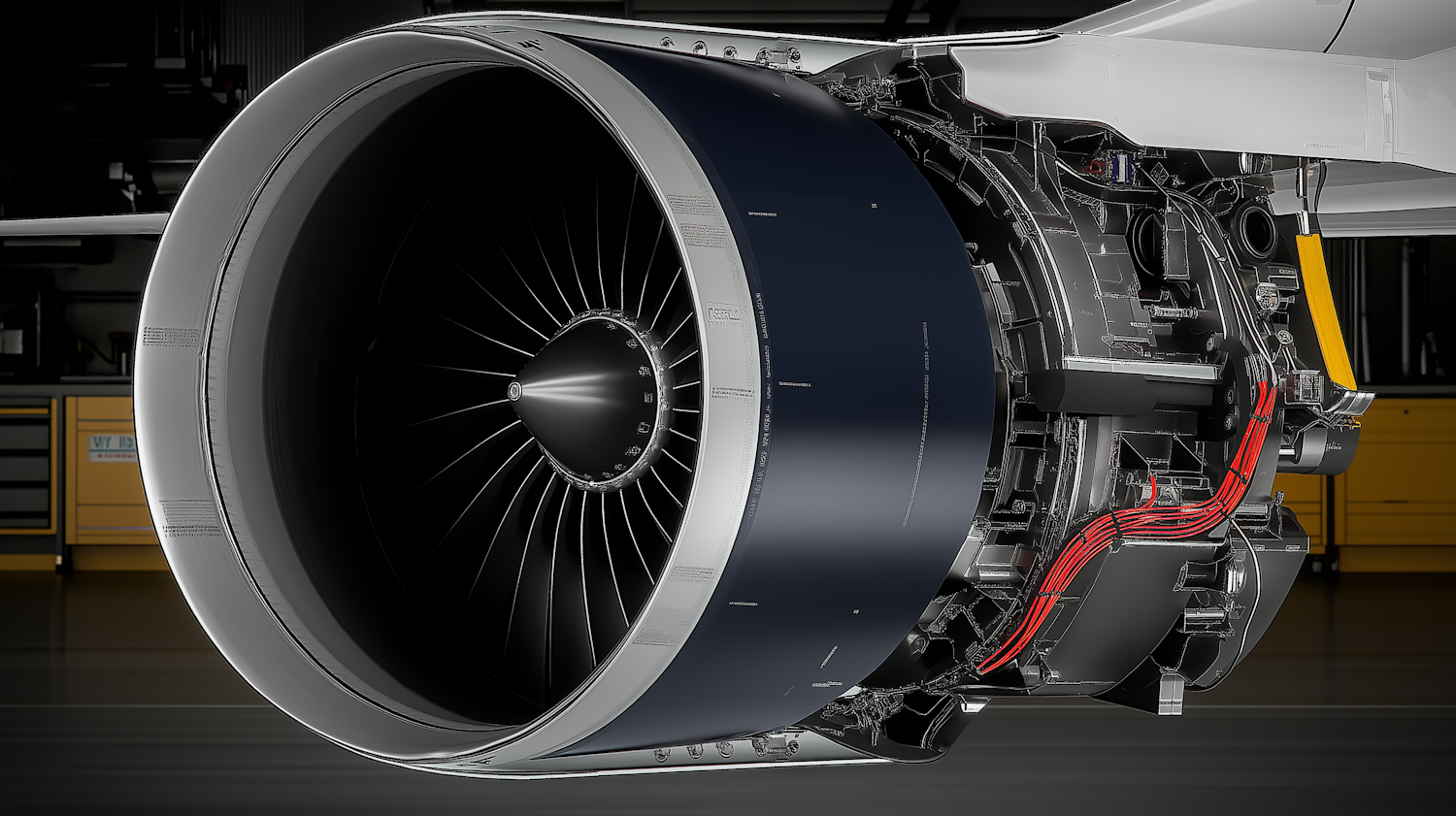 Detailed close-up of a modern jet engine with visible fan blades, red wiring, and a sleek industrial design in a workshop setting.