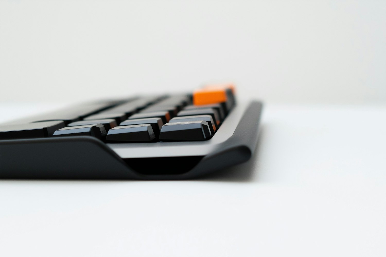 Sleek mechanical keyboard with black and orange keycaps, captured from a low angle, highlighting its modern and ergonomic design.