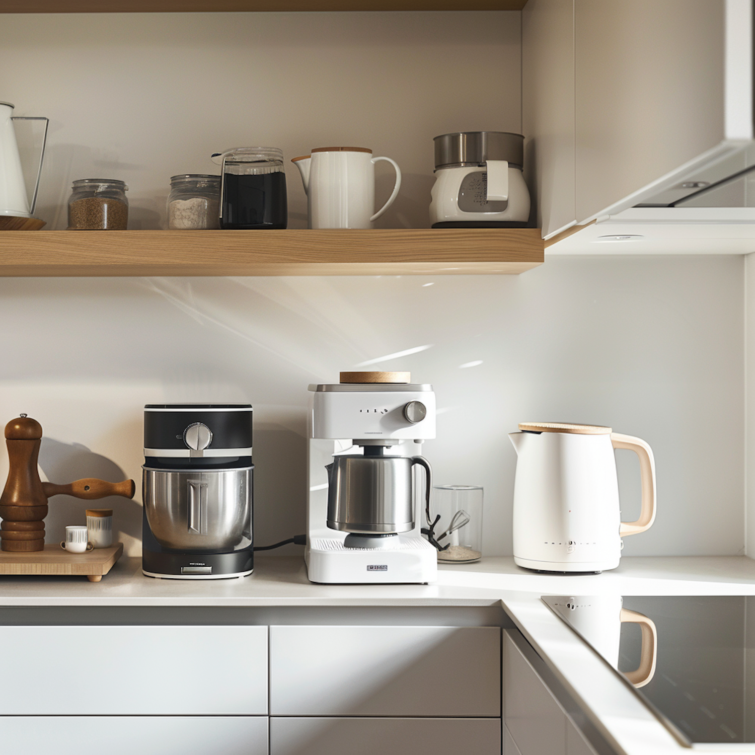 Modern kitchen with sleek appliances: stand mixer, coffee maker, and electric kettle. Neutral tones and organized shelves enhance the aesthetic.