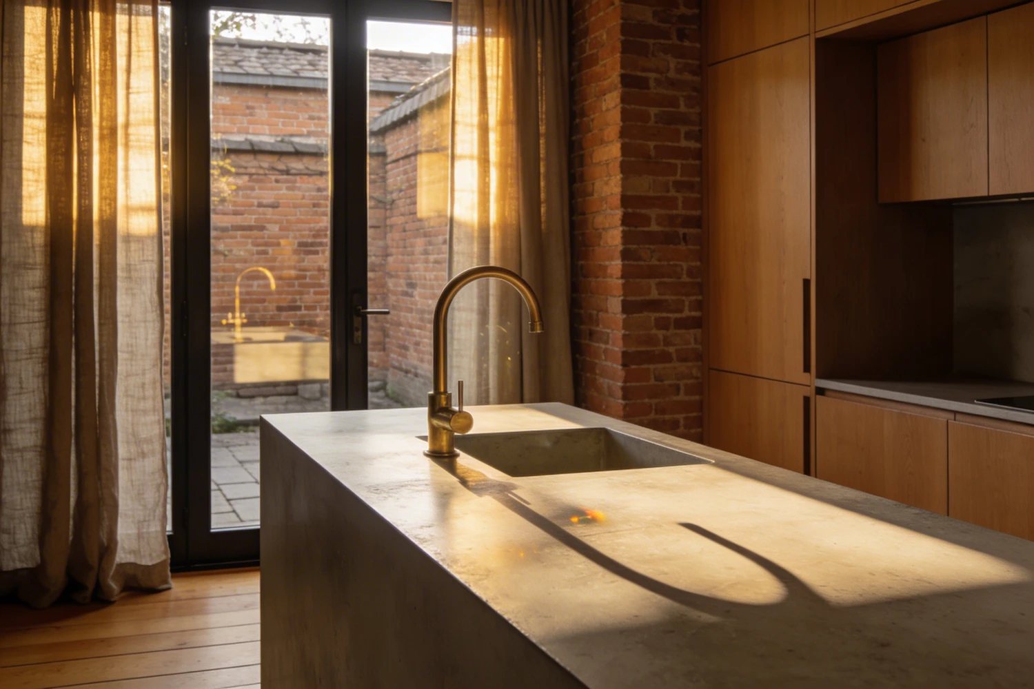 A modern kitchen with a concrete countertop, brass faucet, exposed brick walls, and warm sunlight streaming through glass doors.