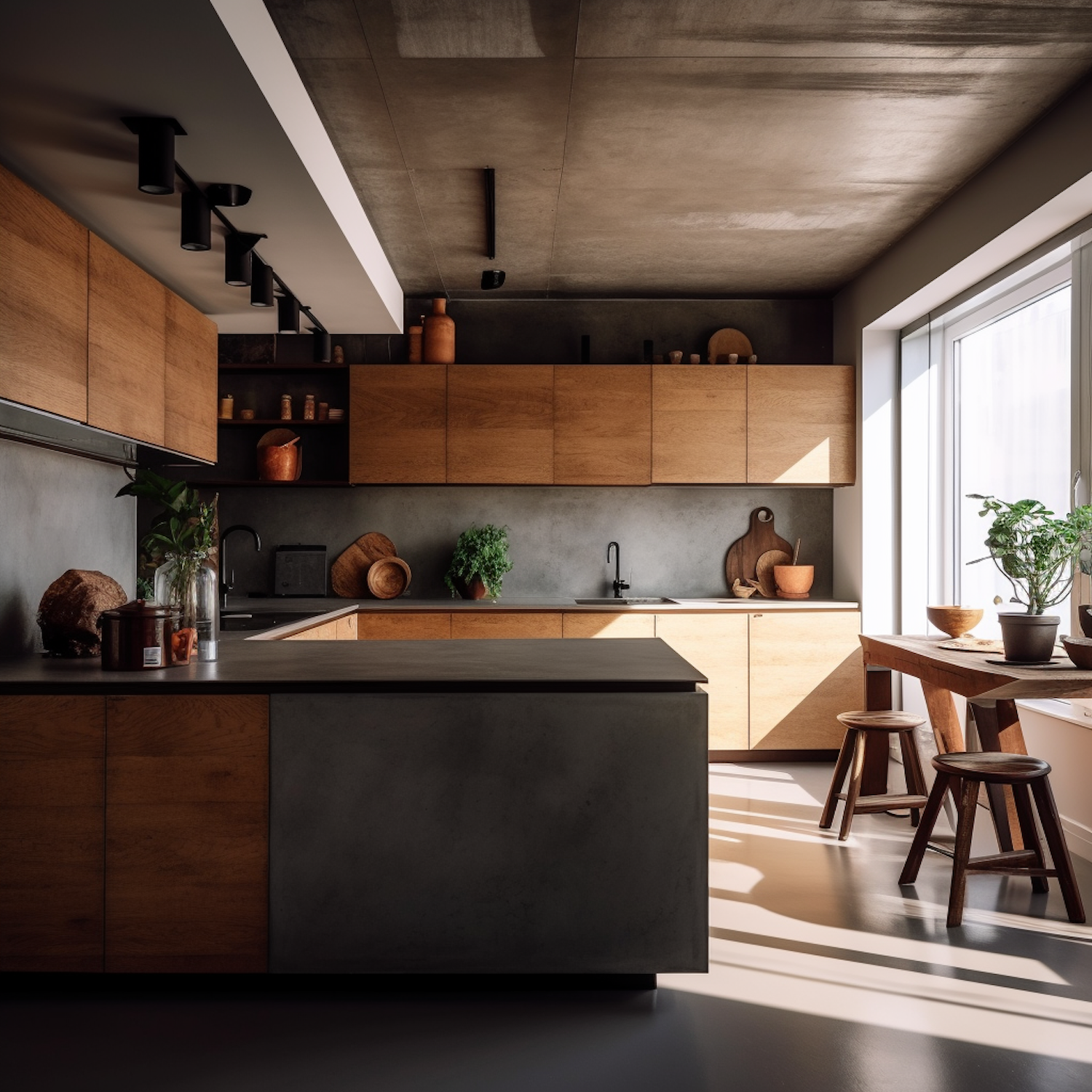 Modern kitchen with light wood cabinets, dark countertops, and natural light. Features potted plants and a cozy dining nook.