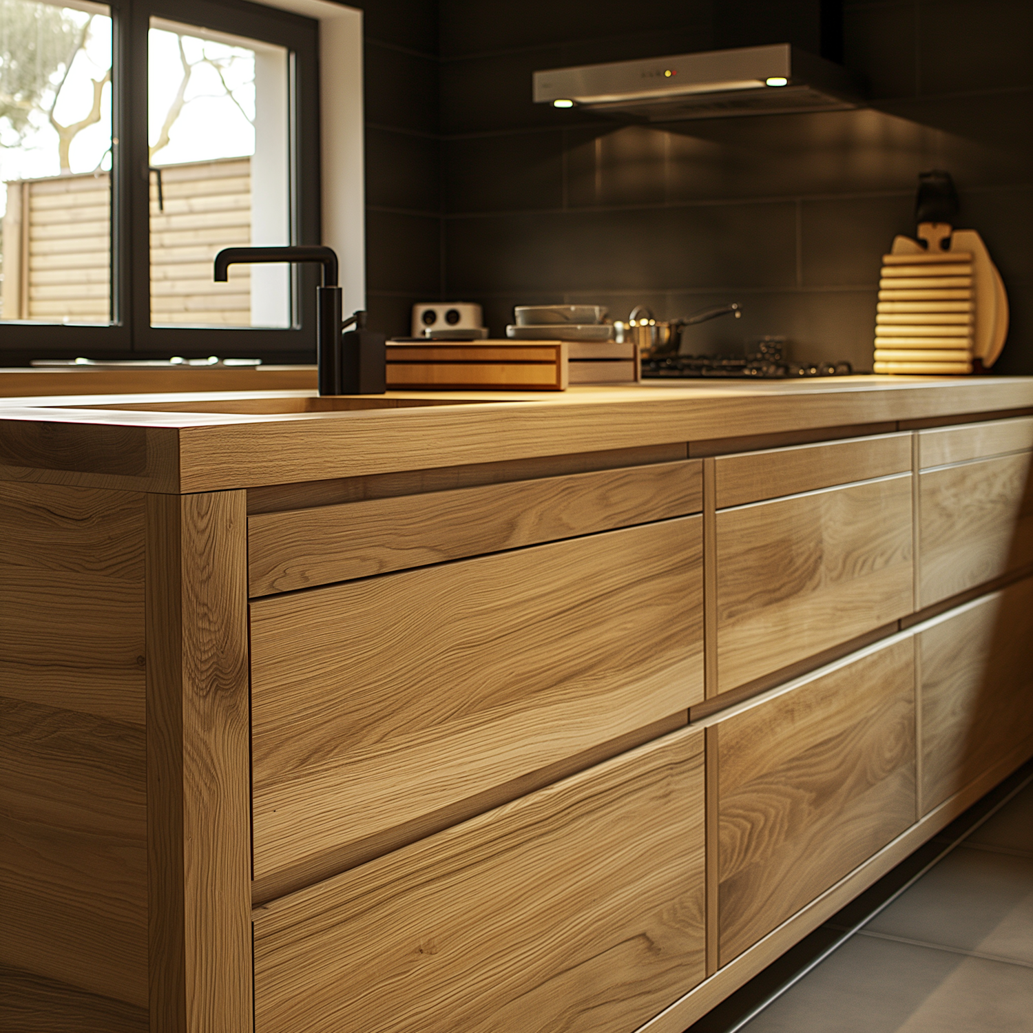 Modern kitchen with a wooden island, black faucet, and stainless steel range hood. Natural light highlights the warm wood tones.