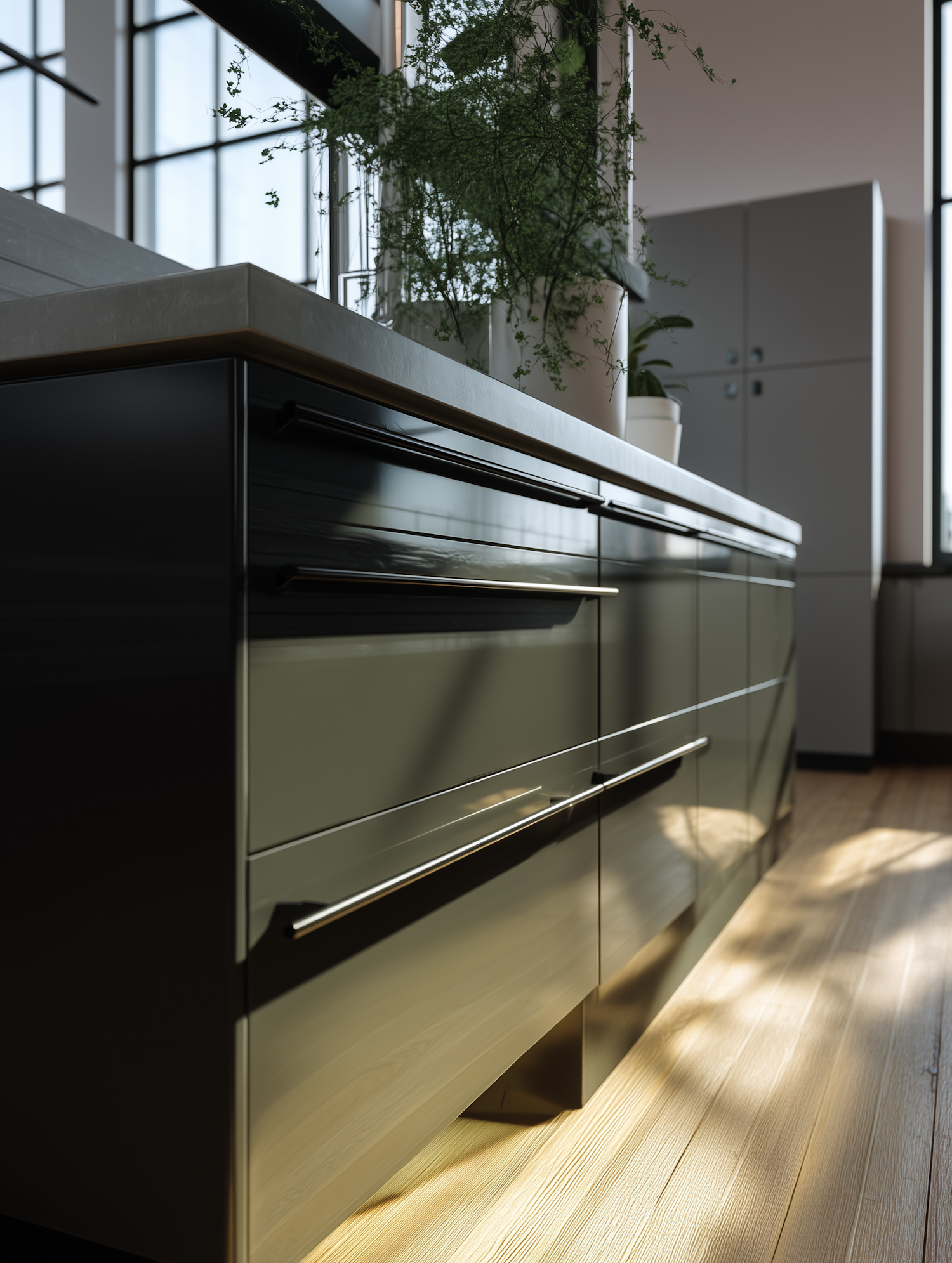 Modern kitchen with dark green cabinets, metallic handles, and sunlight streaming through large windows onto a wooden floor.