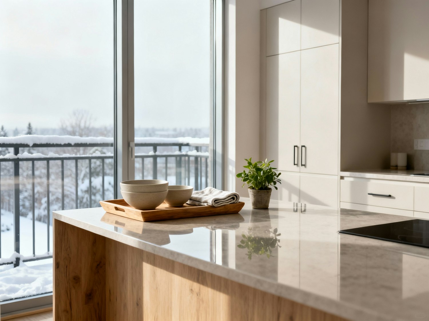 Bright kitchen with light countertop (wood or stone) and tall window in the background showing snow-covered balcony rail; on the island a shallow wooden tray with two neutral bowls and a folded linen, small potted plant for freshness; cabinets in light tones, daylight creating gentle reflections on the counter, overall clean and functional. 35 mm, f/4, ISO 100, 1/160 s. Negative: seasonal ornaments, busy appliances, brand labels.