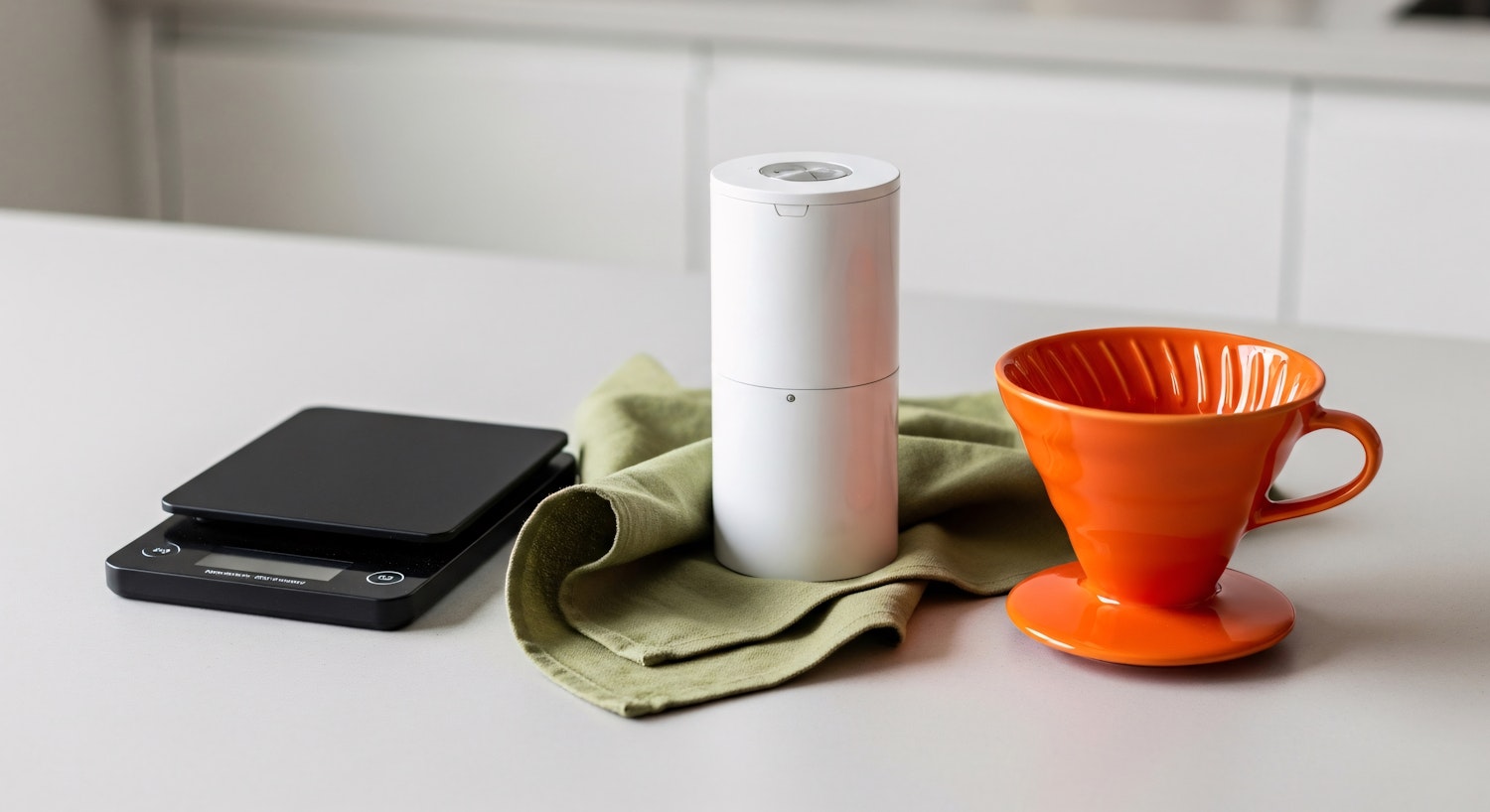 Minimalist coffee setup with a black scale, white grinder, and orange dripper on a light countertop with a green cloth.