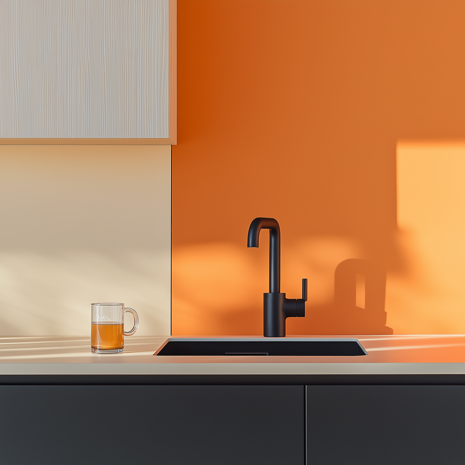 Modern kitchen with a black faucet, orange wall, and light beige countertop. A glass mug of tea adds a cozy touch to the sleek design.