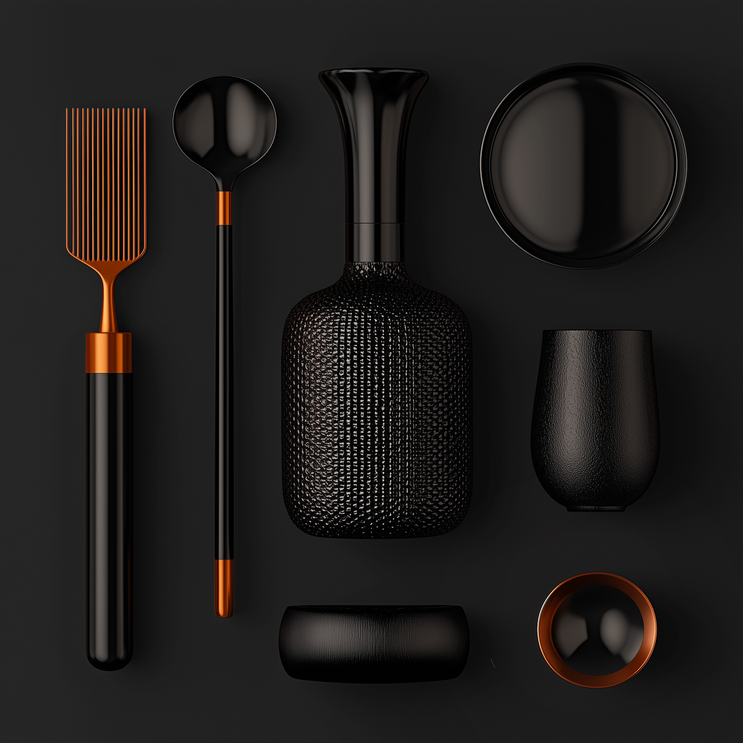 Sleek black and copper kitchen utensils and containers on a dark background, featuring a textured bottle and elegant design.