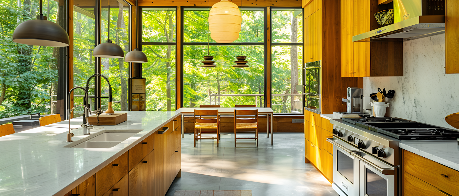 Bright modern kitchen with large windows, marble countertops, and wooden cabinetry, offering a scenic view of lush greenery.