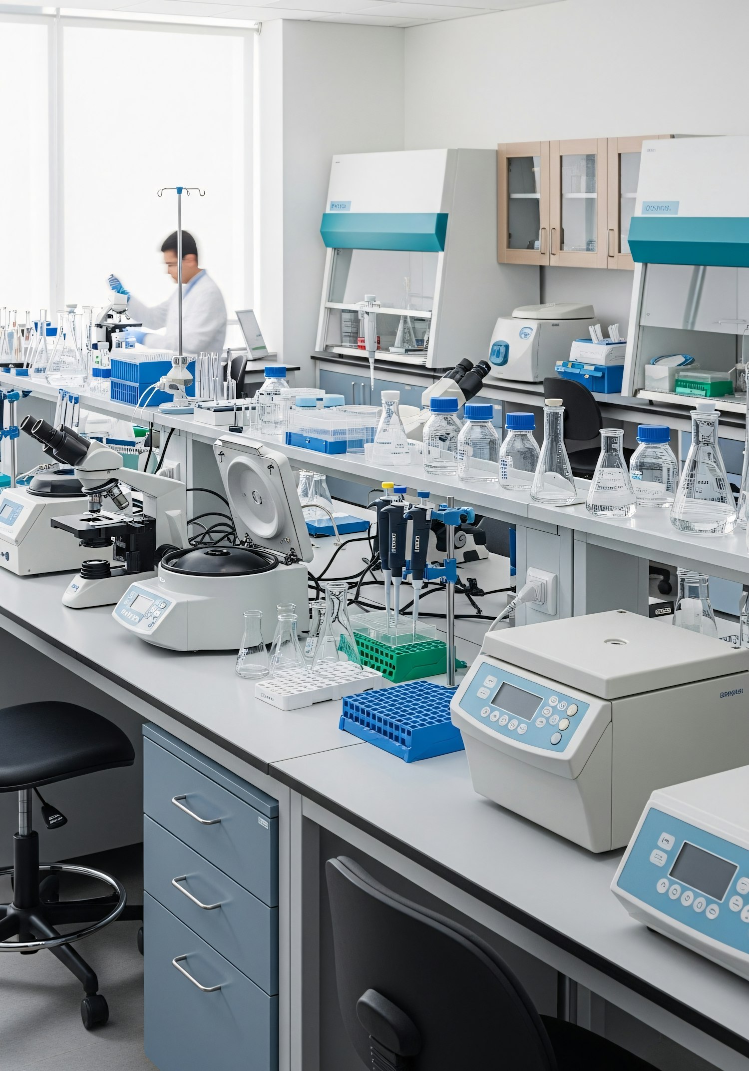 Bright, modern laboratory with scientific equipment, glassware, and a researcher in a white coat working in the background.