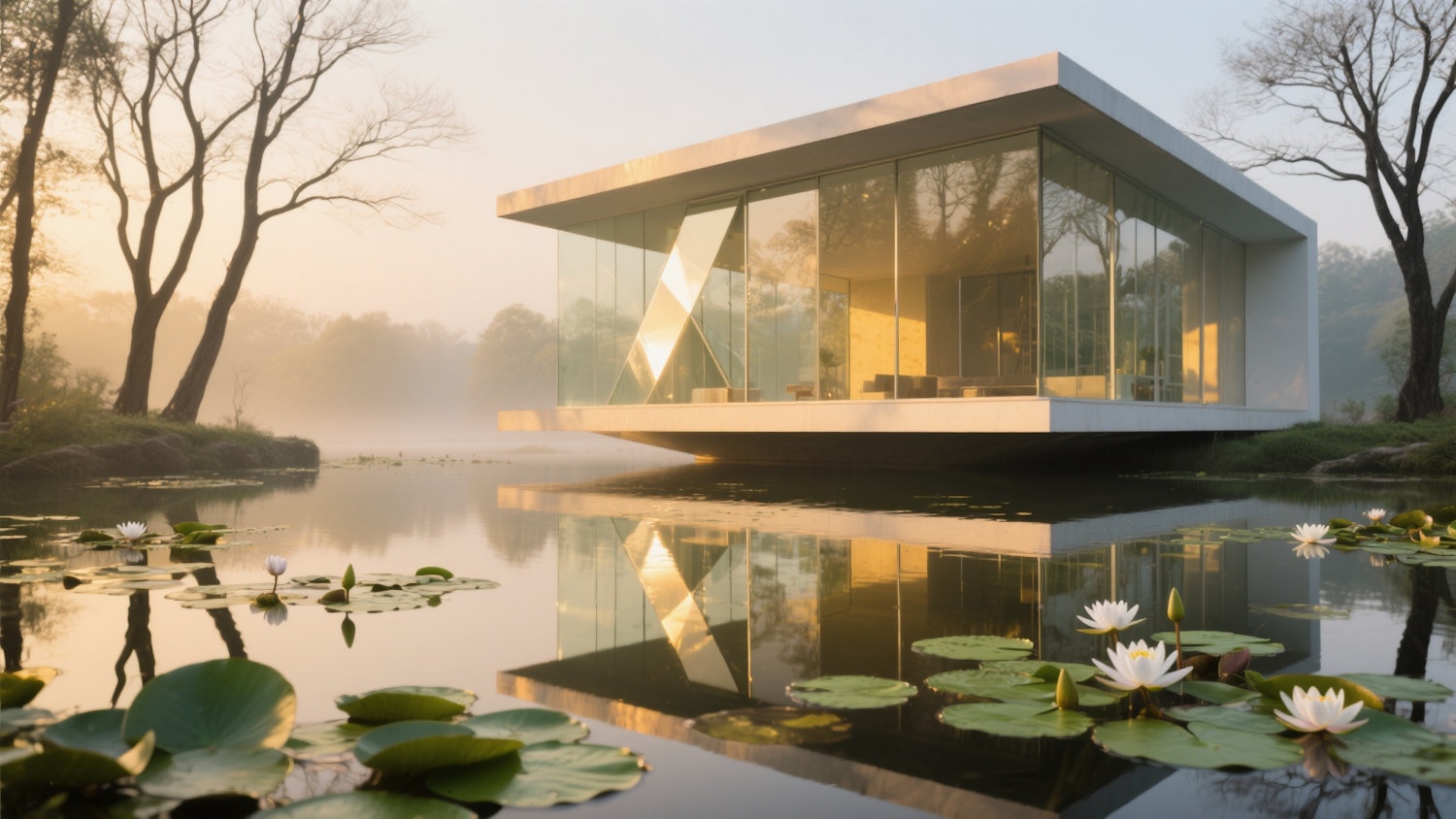 A modernist glass pavilion floating above a lily pond, silhouette of leafless trees reflected below, golden light through prism windows, serene architectural mood