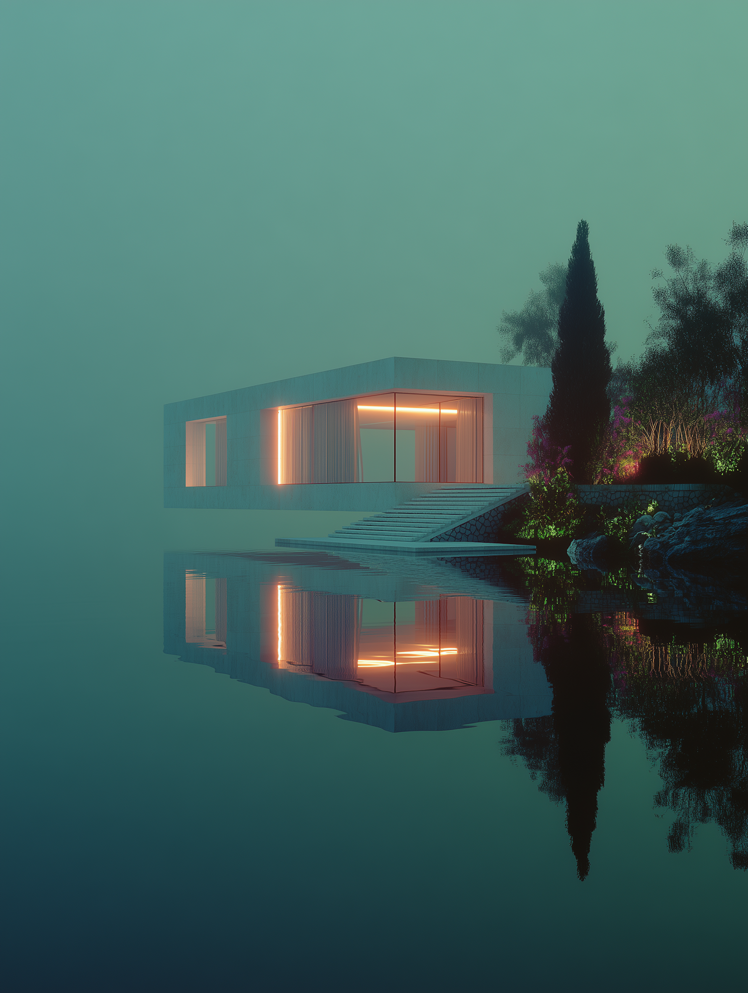 A modern house with warm lighting reflects on a tranquil lake, surrounded by mist and lush greenery, creating a serene atmosphere.