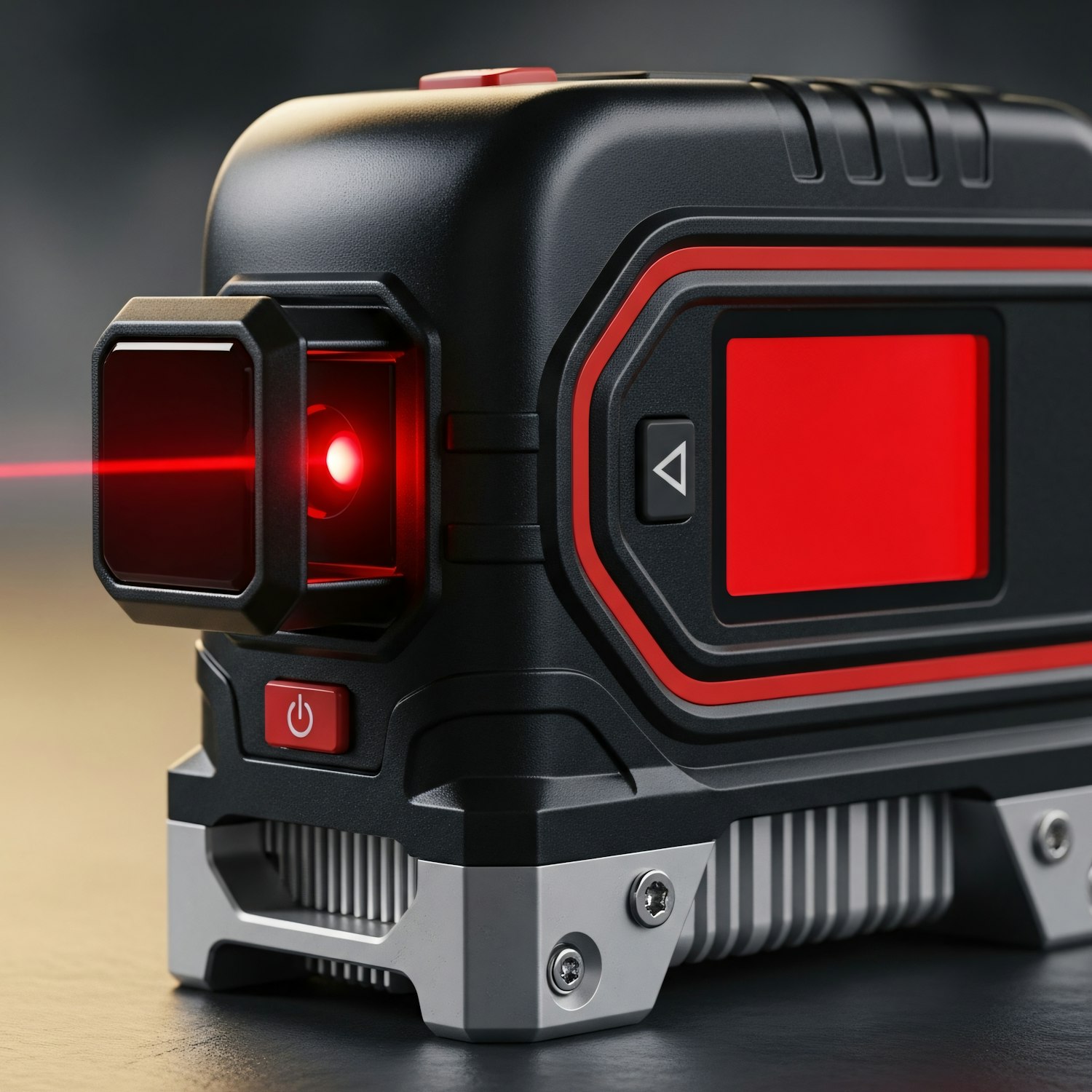 Close-up of a sleek black and red laser measuring tool with a visible red laser beam, digital display, and durable metallic accents.