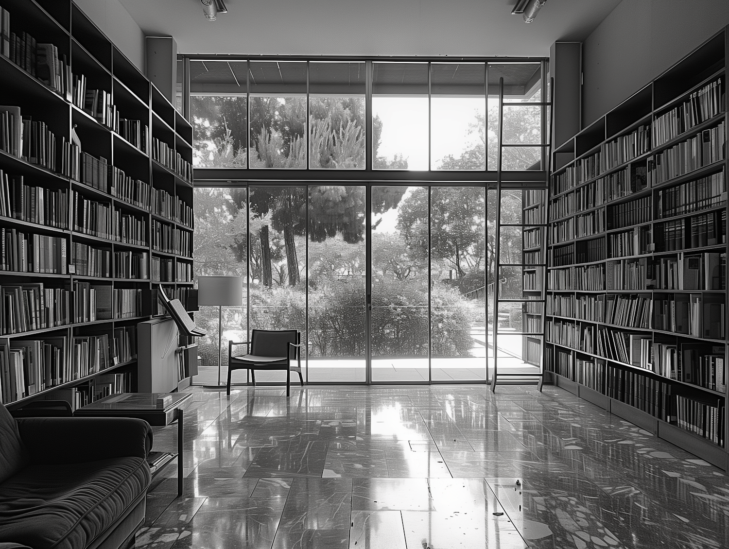 Elegant library with tall bookshelves, large windows, and a serene view of greenery. Perfect for quiet reading and reflection.