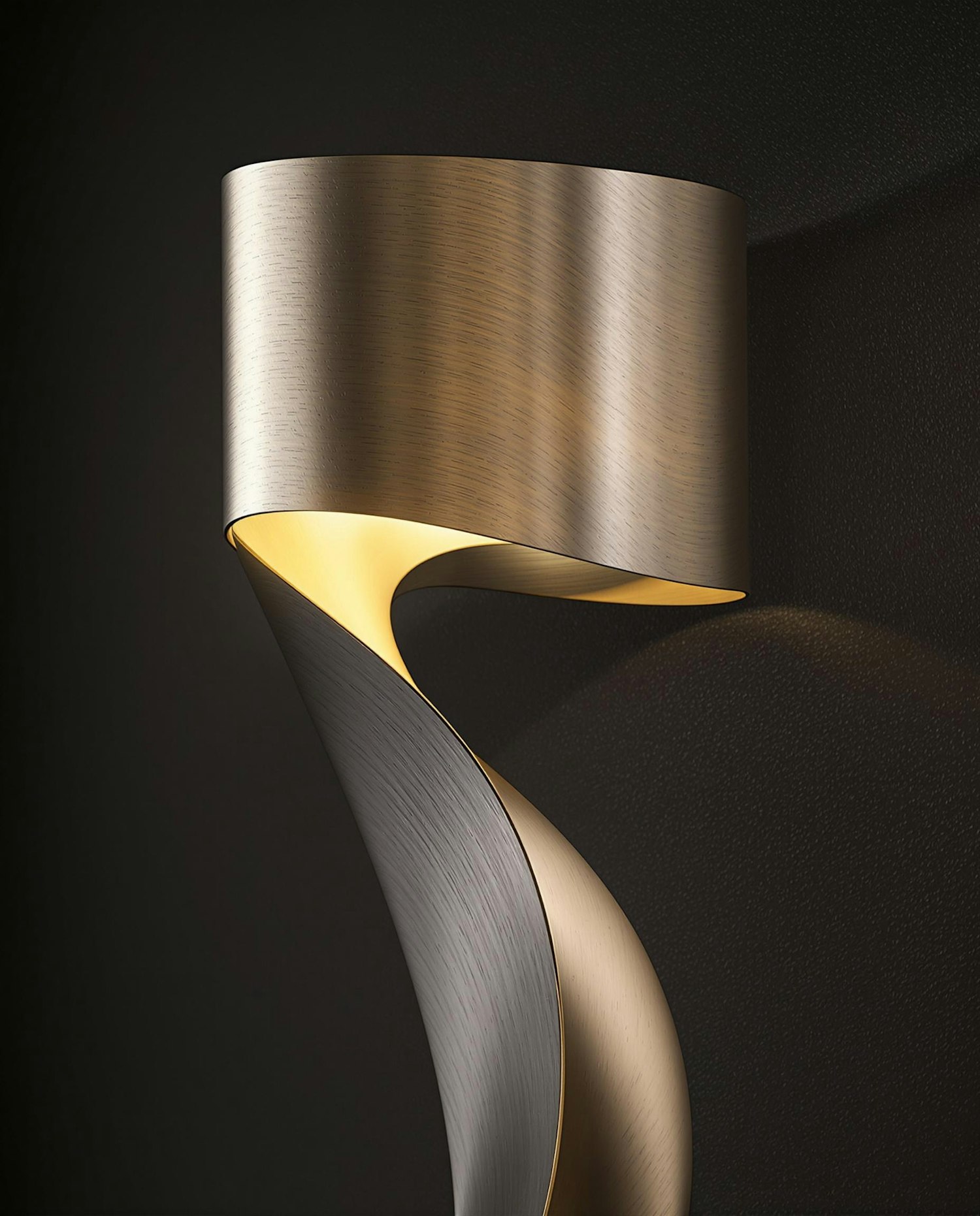 Sleek modern wall light with a twisted metallic design, brushed gold and black finish, and warm ambient lighting. Perfect for stylish interiors.