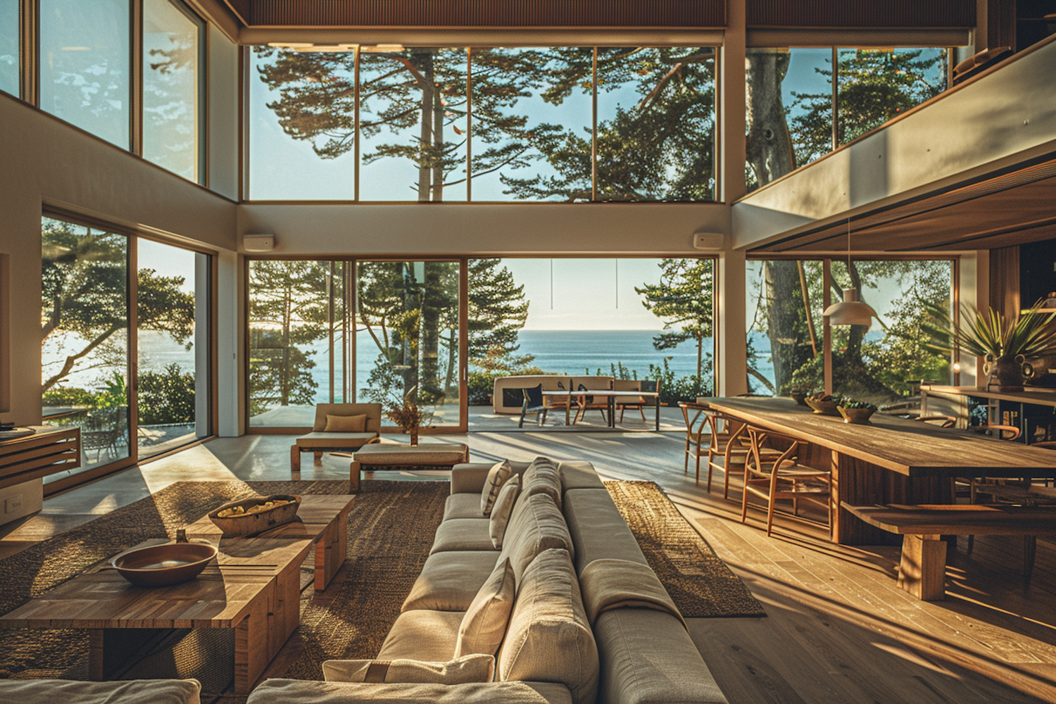 Modern living room with ocean view, large windows, beige sofa, wooden furniture, and natural light creating a warm atmosphere.
