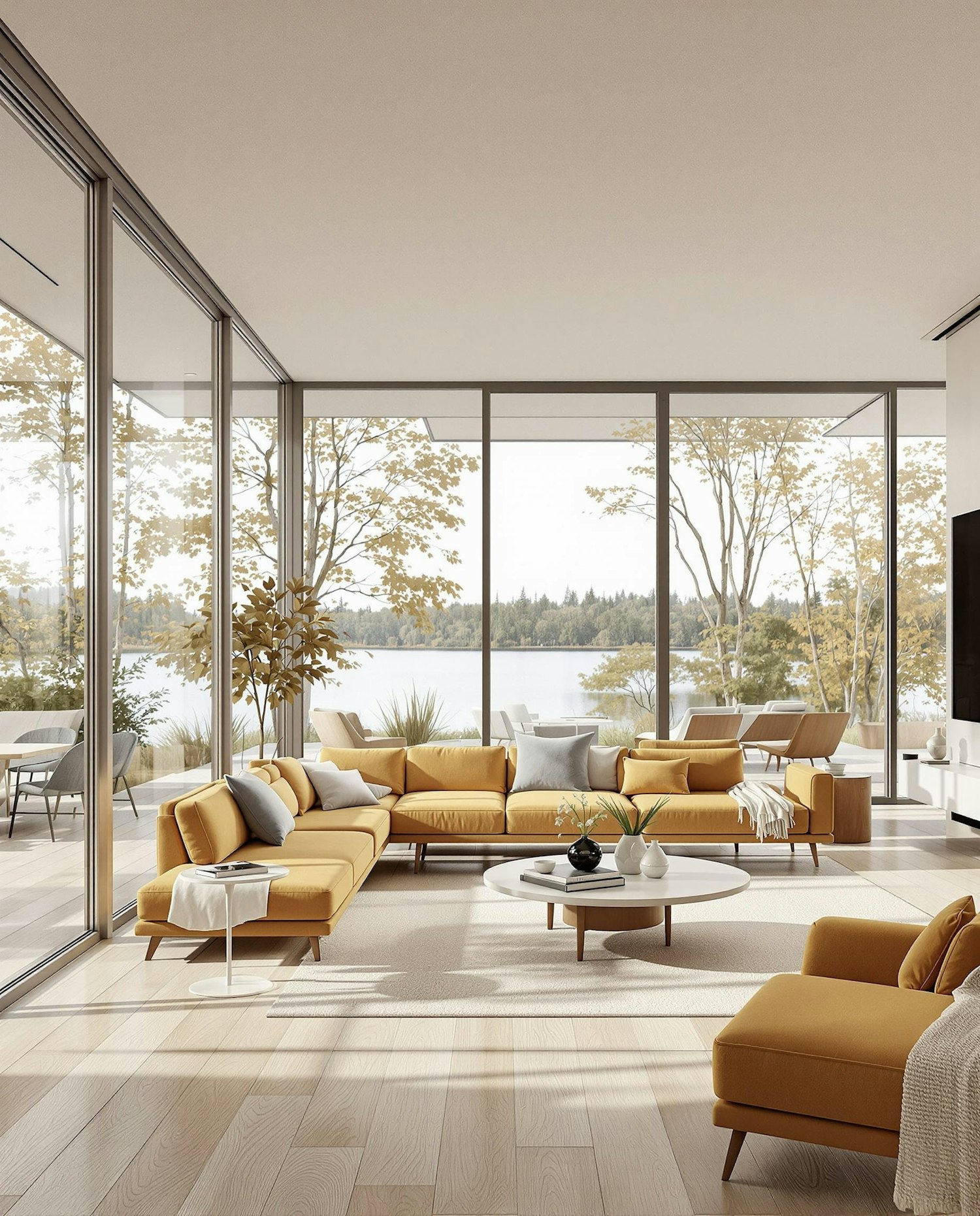 Bright living room with mustard-yellow furniture, floor-to-ceiling windows, and a serene lake view. Perfect blend of modern and cozy.