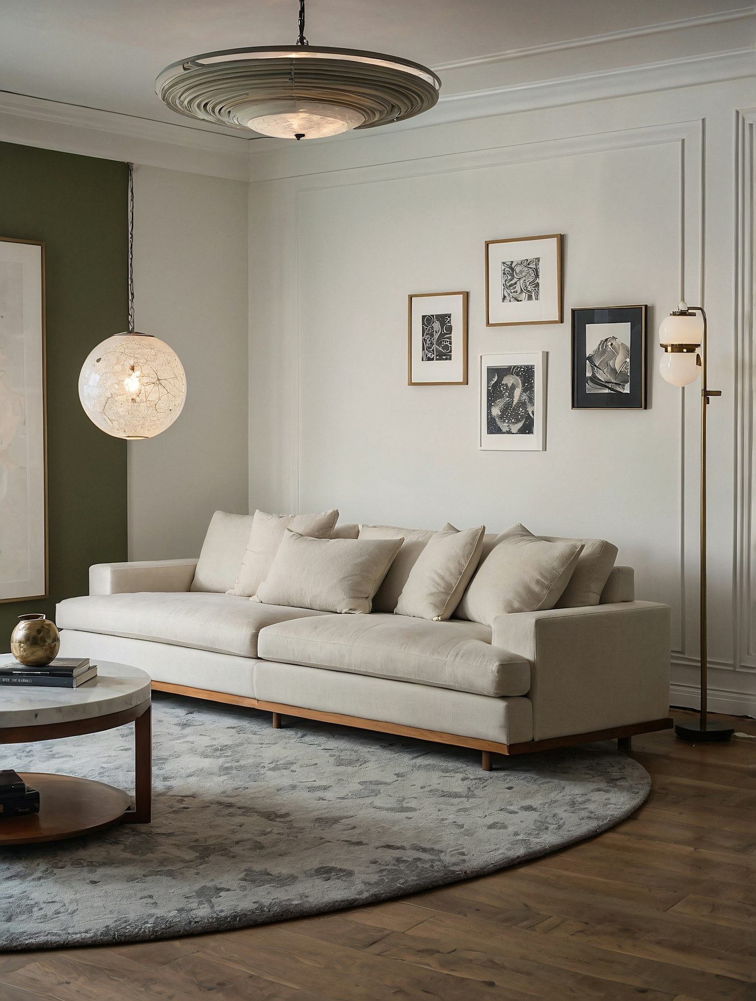 Modern living room with beige sofa, gallery wall, round rug, marble coffee table, and unique pendant lighting.