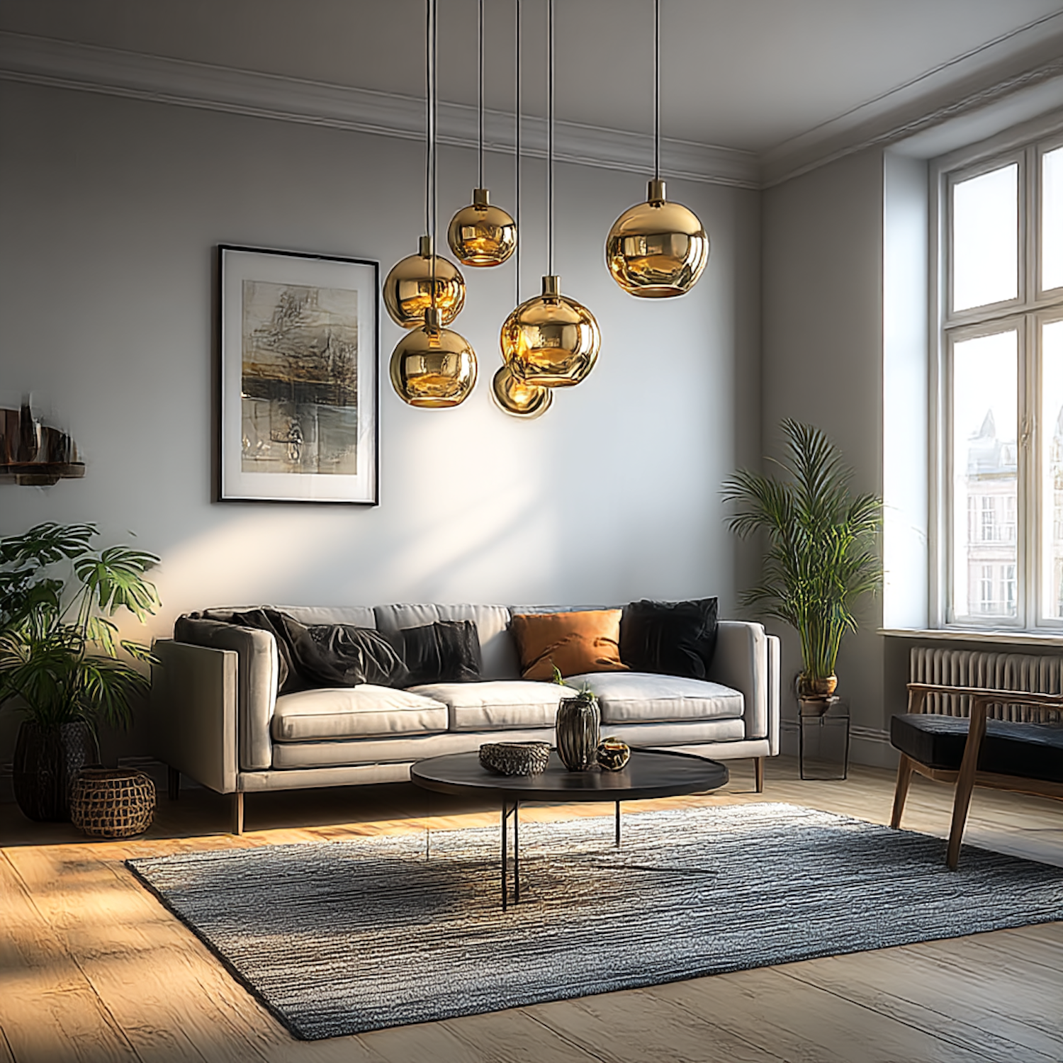 Modern living room with golden pendant lights, a gray sofa, and green plants, creating a cozy and stylish ambiance.