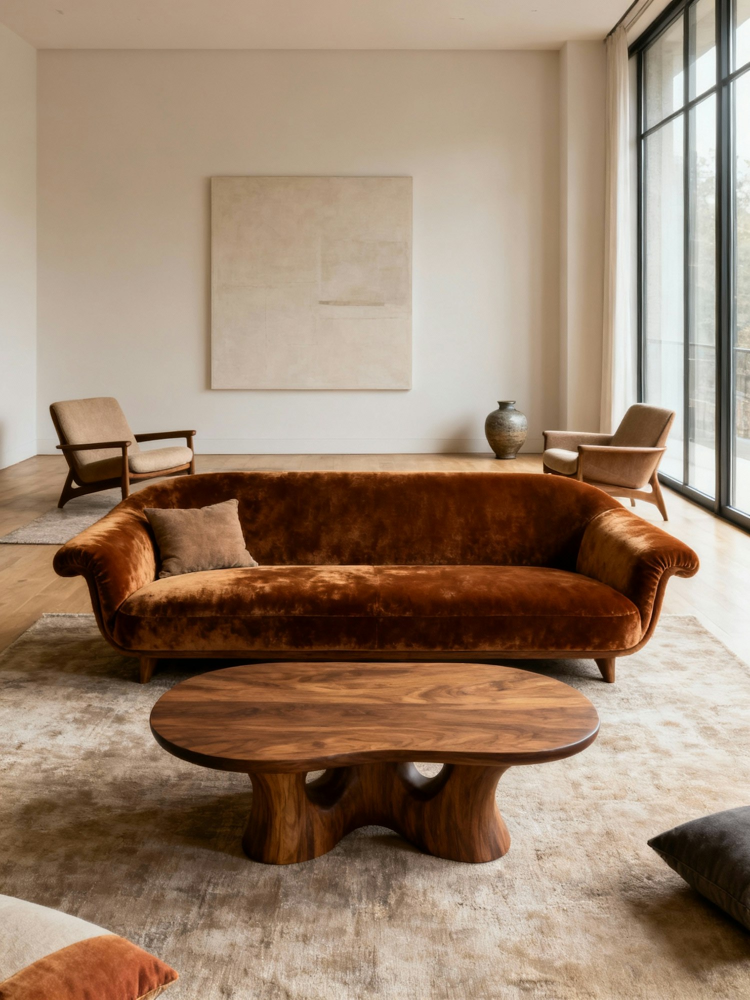 Professional interior design photography, warm and textured atmosphere, soft natural lighting, retro-modern aesthetic, mid-century inspired furniture, crafted wooden details, neutral tones with accents of earthy colors, editorial style, timeless and sophisticated mood. A frontal shot of a living room with a retro velvet sofa and sculptural coffee table. The furniture is centered in the frame, photographed straight-on with a balanced, symmetrical composition. Minimal artwork on the wall and large windows in the background create a clean, modern-retro aesthetic.