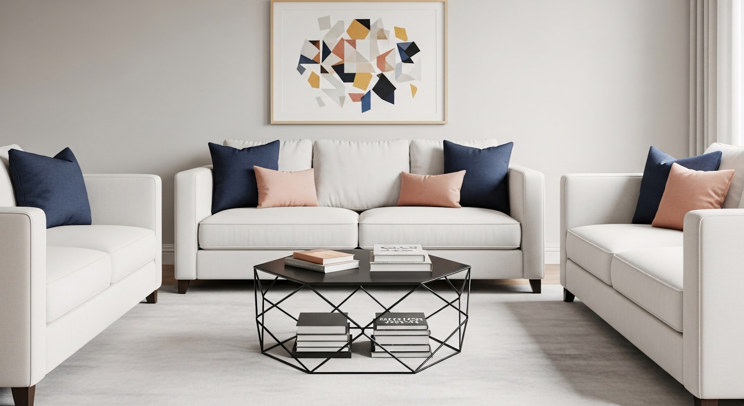 Modern living room with white sofas, navy and peach pillows, a geometric coffee table, and abstract wall art in a bright, minimalist setting.