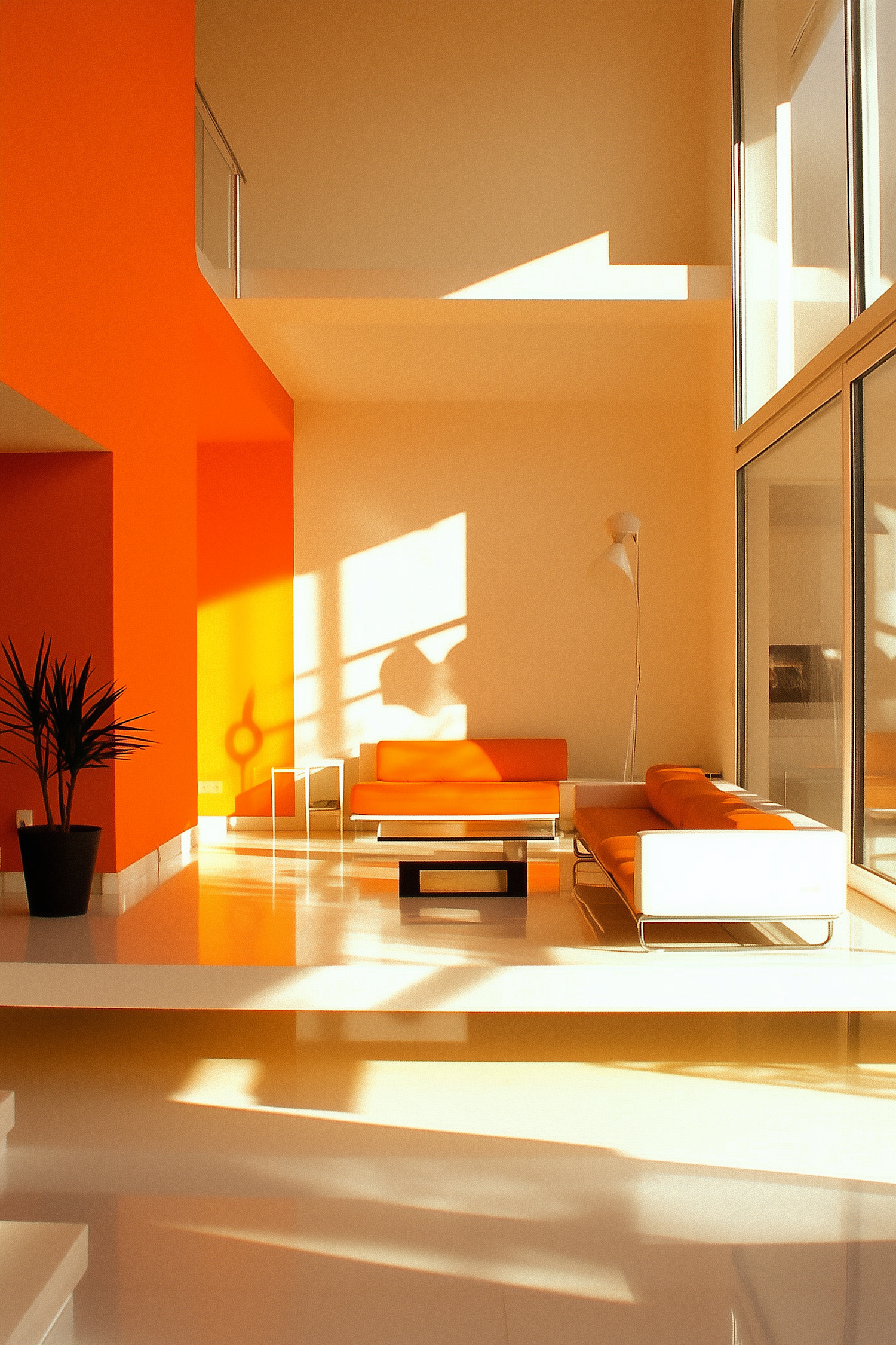 Modern living room with orange and white furniture, large windows, and minimalist decor bathed in warm sunlight.