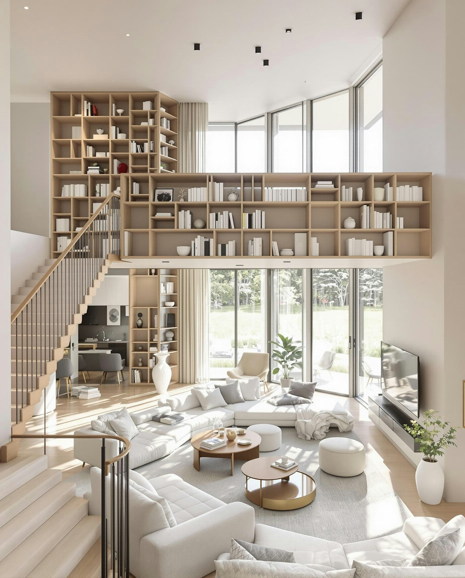 Bright, modern living room with floor-to-ceiling windows, cozy sectional sofa, and a mezzanine library. Perfect blend of style and comfort.