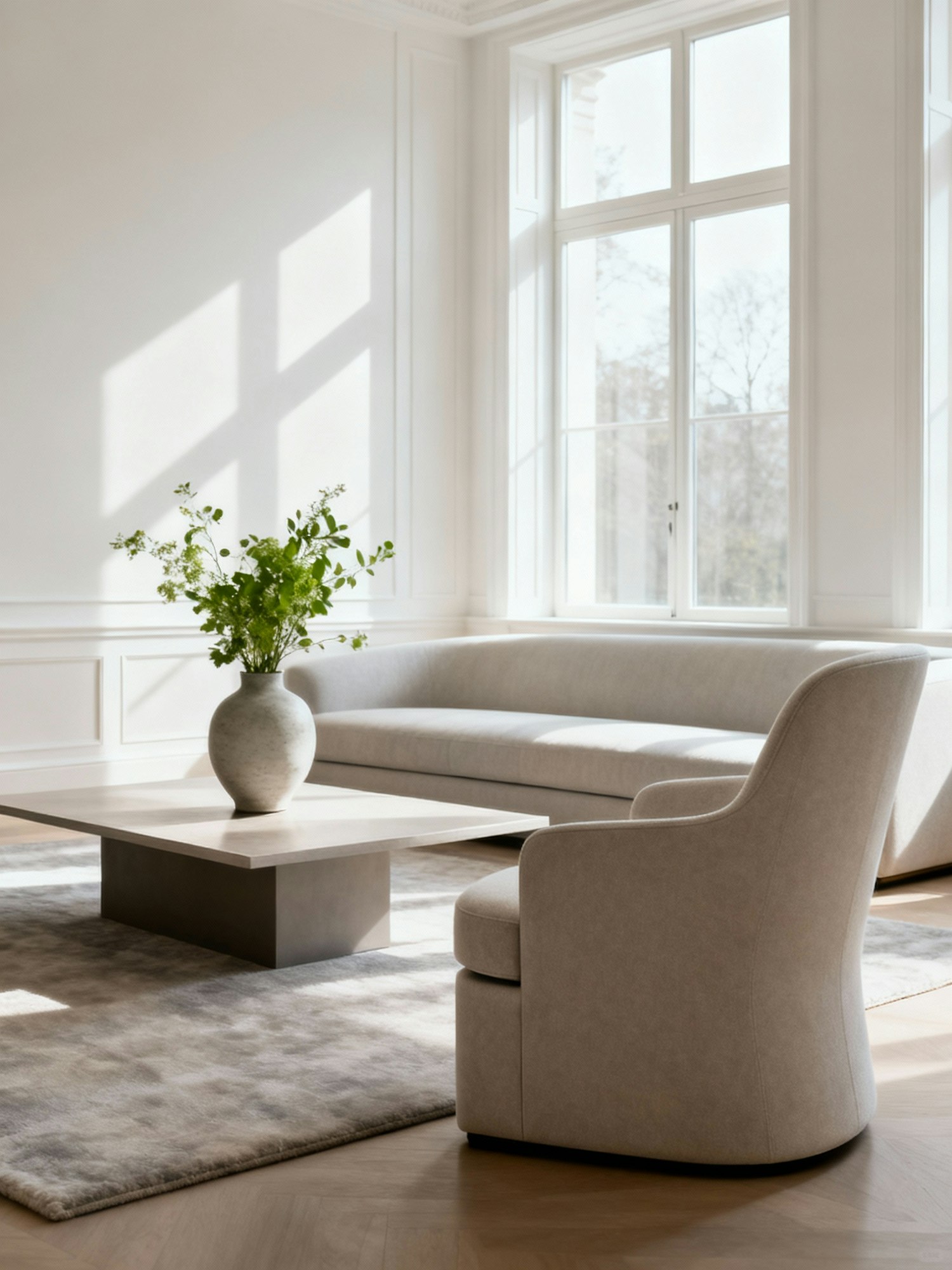 A beautiful room with a bright minimalist interior, clean lines, natural light, soft neutral tones, elegant modern furniture, calm atmosphere, spacious composition, realistic photography style, high-end contemporary design.