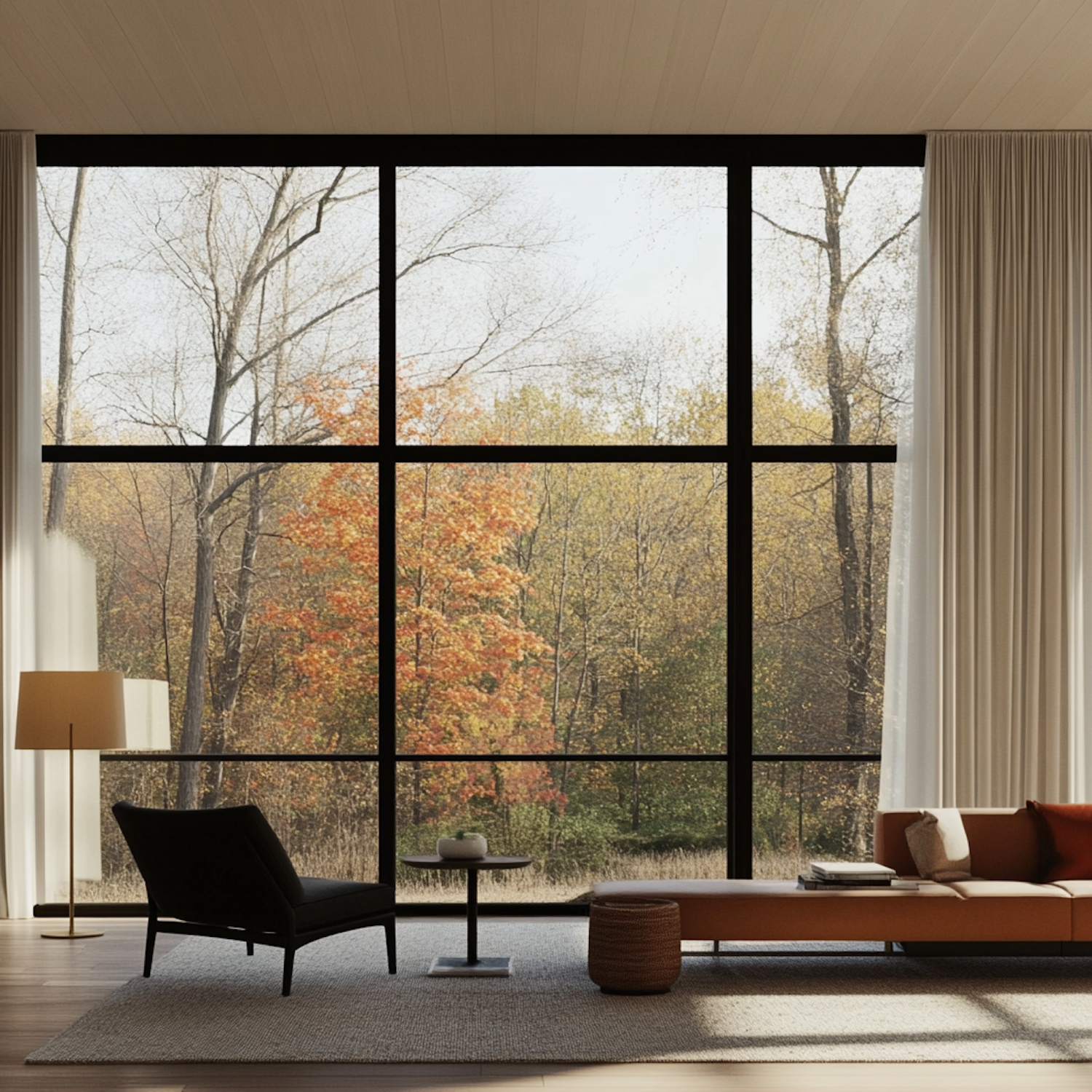 Modern living room with floor-to-ceiling windows, autumn forest view, sleek furniture, and warm, minimalist decor.