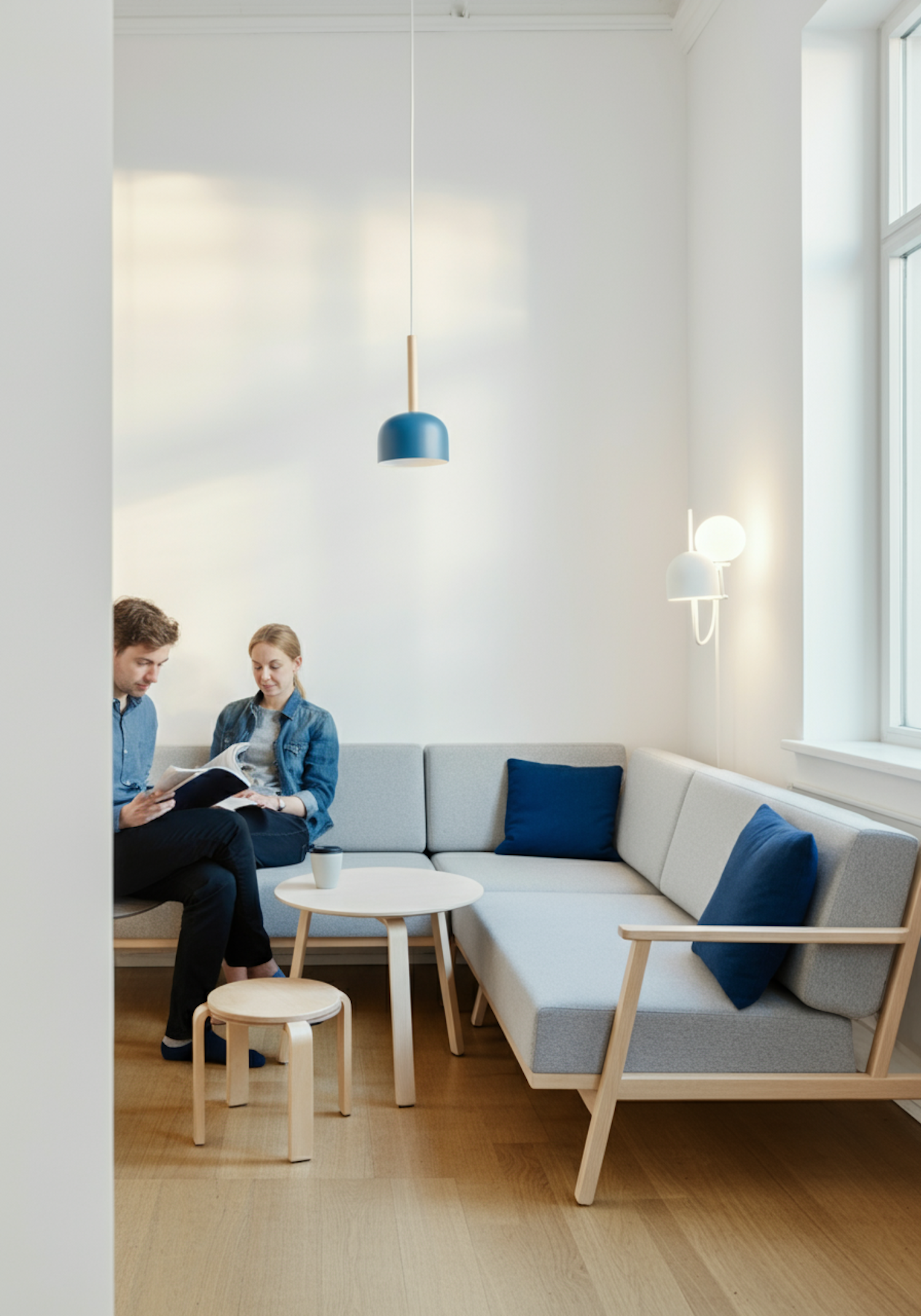 A modern living room with a gray sofa, blue pillows, and light wood furniture, featuring two people reading together in natural light.