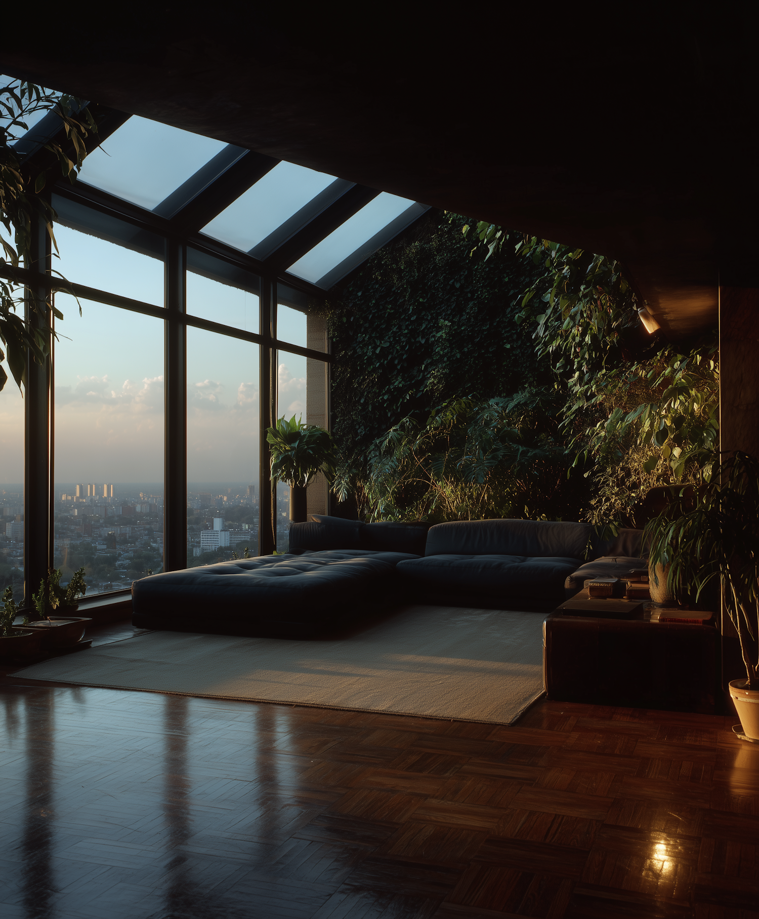Modern living room with city views, lush greenery, and warm sunlight creating a cozy and natural ambiance.