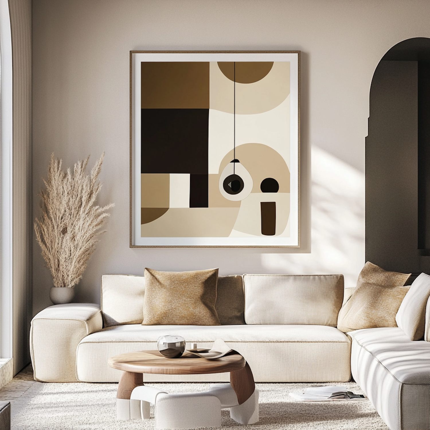Modern living room with beige sectional sofa, abstract geometric painting, and natural light. Features pampas grass and wooden coffee table.