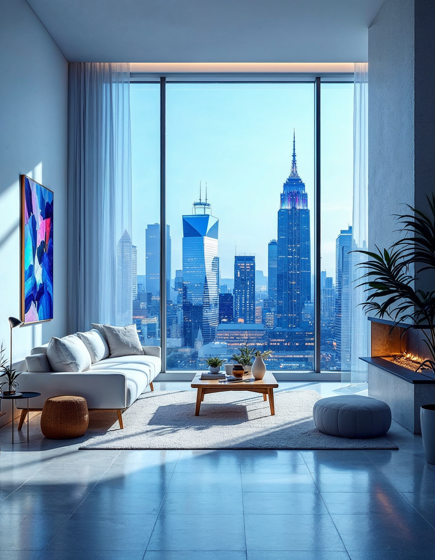 Modern living room with city skyline view, white sofa, abstract art, and fireplace. Elegant and serene interior design.
