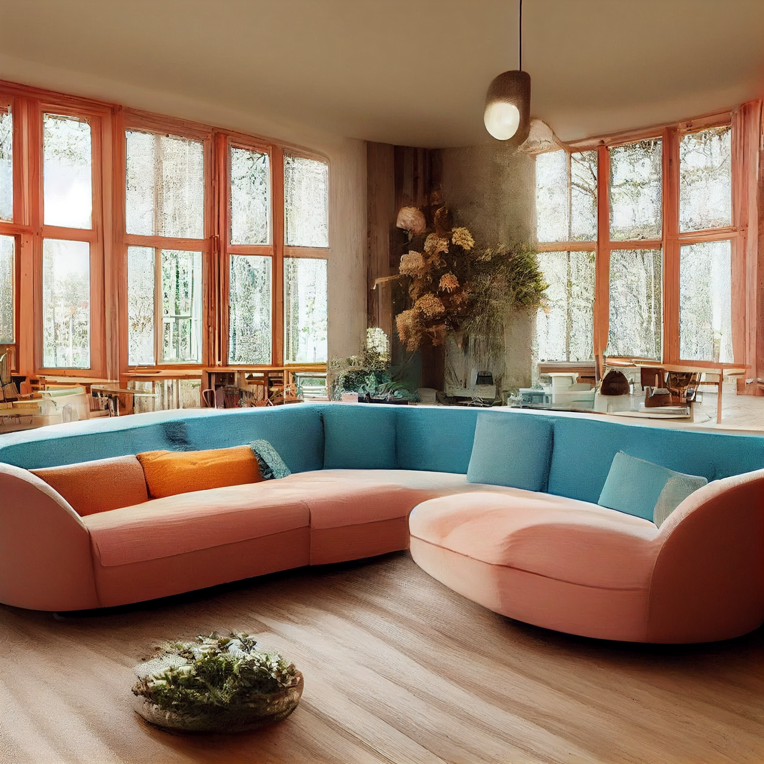 Modern living room with pastel curved sofa, large windows, and natural decor. Cozy and stylish interior design.