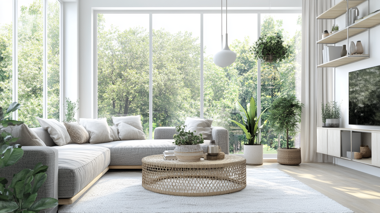 Bright, modern living room with large windows, gray sofa, wicker coffee table, and lush greenery. Neutral tones create a serene atmosphere.