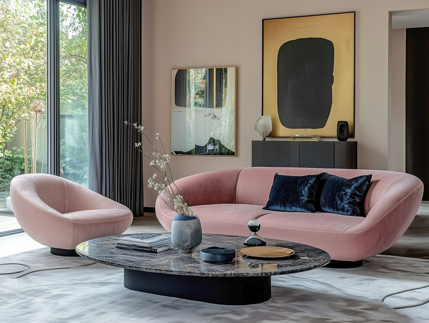 Chic living room with pink velvet sofa, marble coffee table, and abstract art. Modern elegance with natural light and stylish decor.