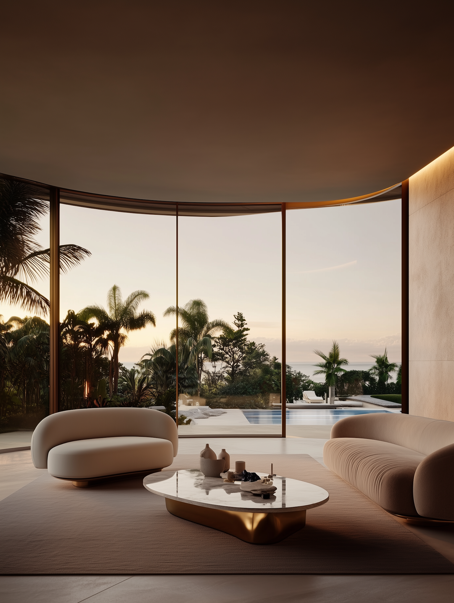 Modern living room with curved sofas, marble coffee table, and tropical views through floor-to-ceiling windows at sunset.