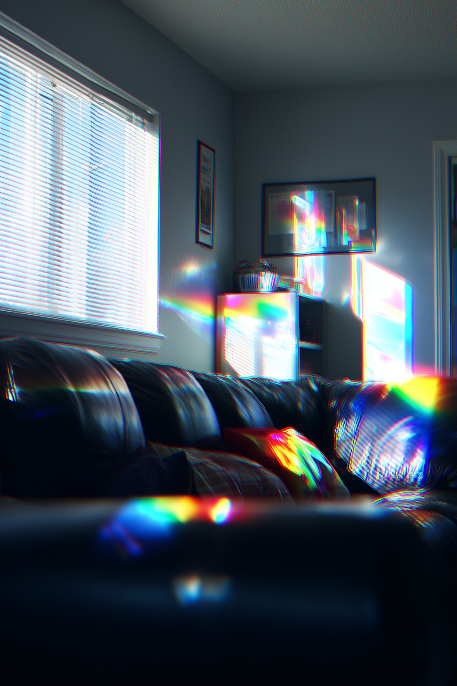 Relaxing living room scene with colorful light refractions on modern furniture, a sleek black leather sofa, and gentle natural light.