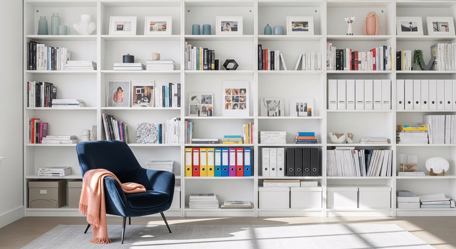 Bright and modern living space with a navy armchair, pink throw, and a large white bookshelf filled with books and decor.