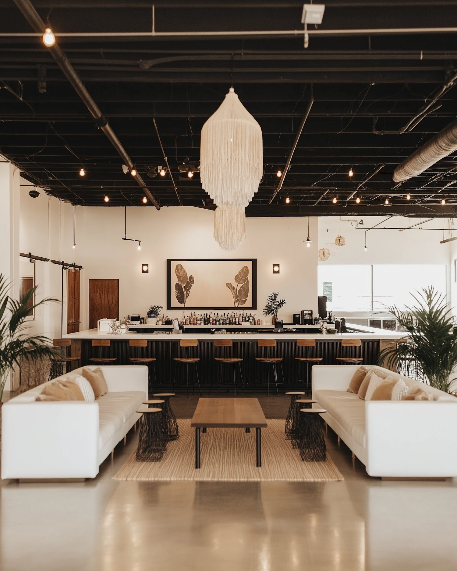 Chic lounge with white sofas, a sleek bar, and a fringe chandelier. Perfect blend of modern and cozy with warm tones and greenery.