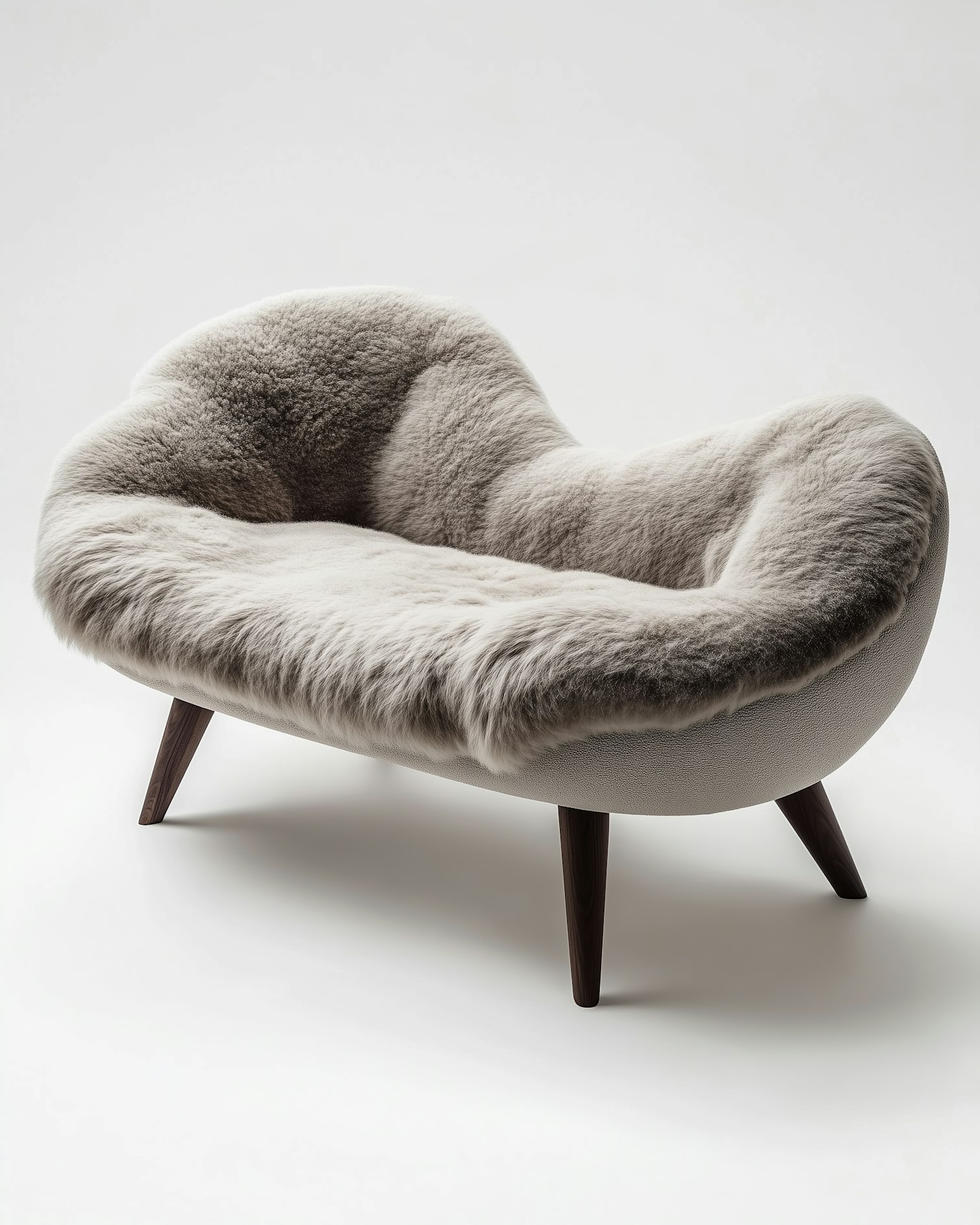 A stylish lounge chair with soft gray fur-like upholstery and dark wooden legs, perfect for modern and cozy interiors.