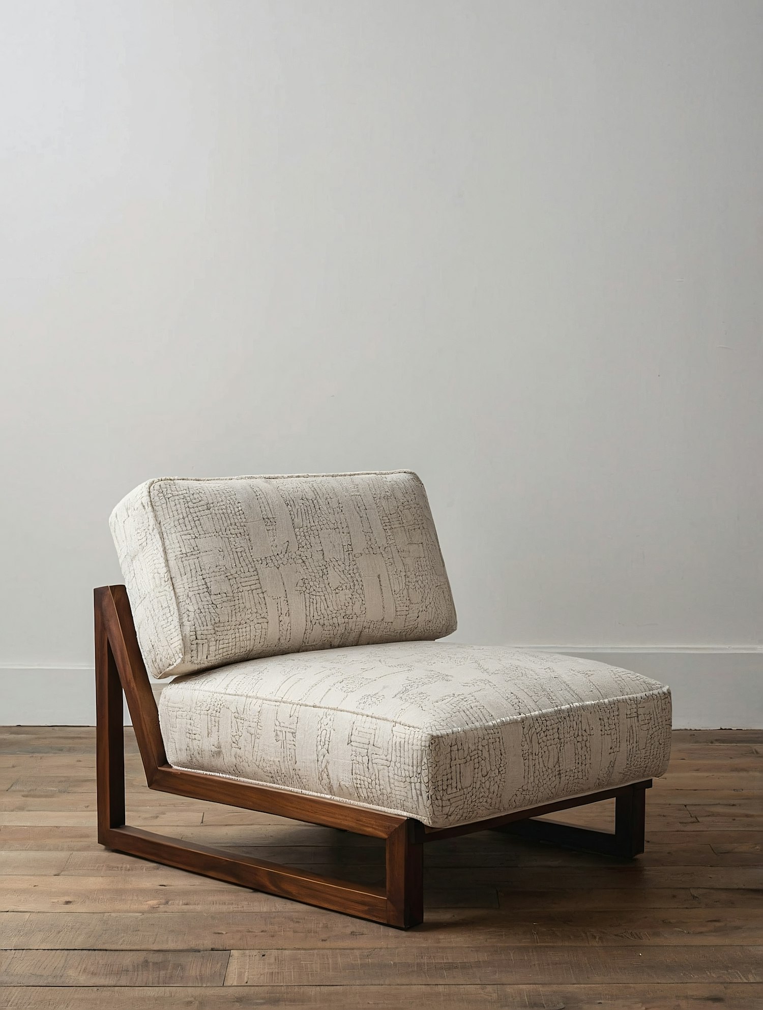 Modern lounge chair with a geometric wooden frame and textured off-white upholstery, set against a minimalist gray wall and wooden floor.