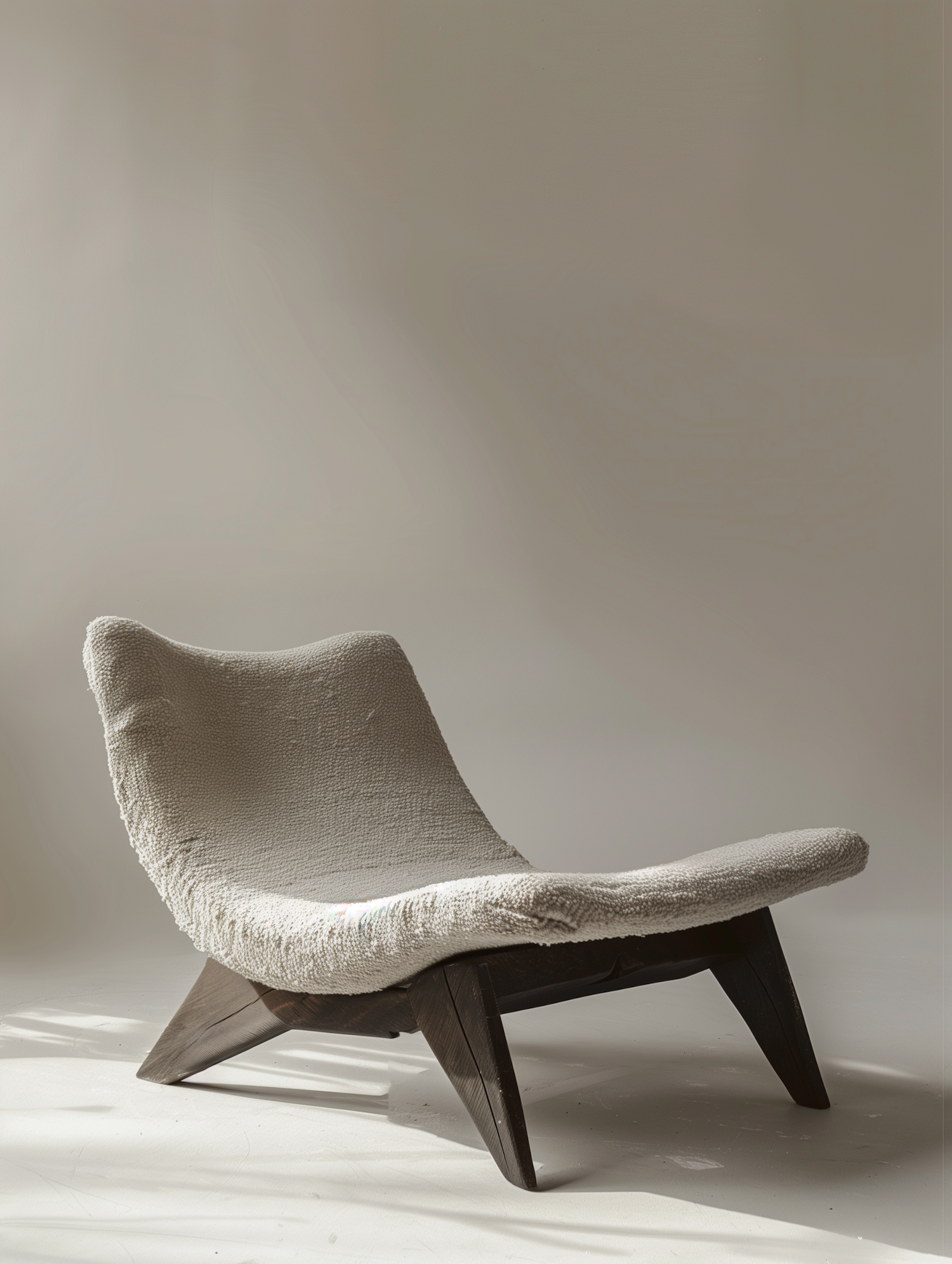 Minimalist lounge chair with beige textured upholstery and dark wooden base, perfect for modern interiors. Stylish and ergonomic design.
