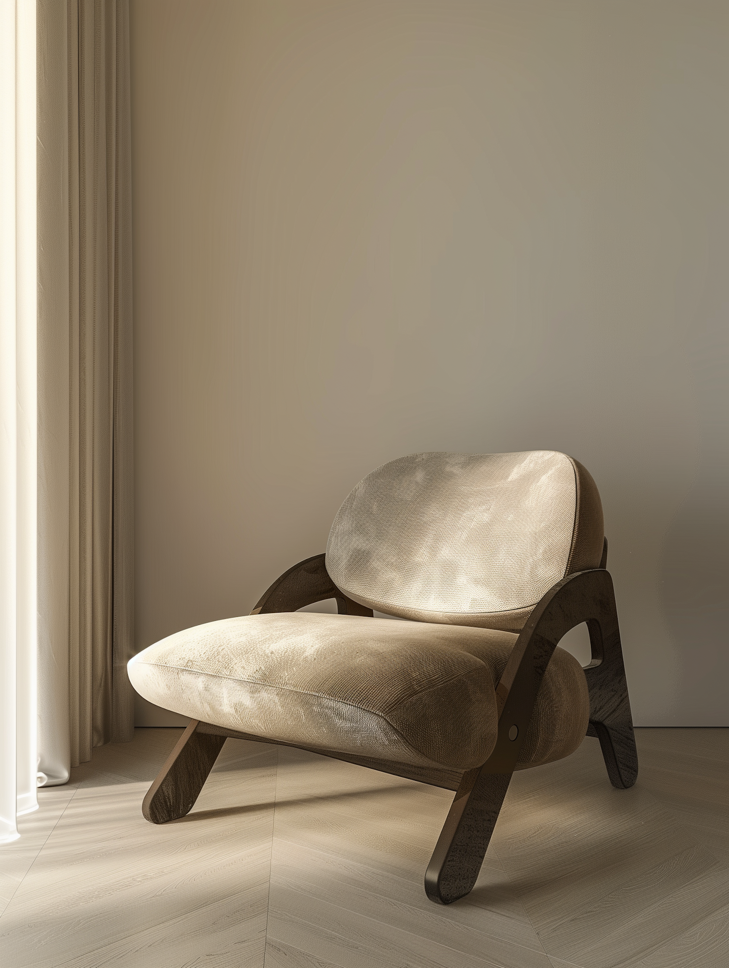 Minimalist beige lounge chair with dark wood frame in a softly lit room. Perfect for cozy, modern interiors with a serene vibe.