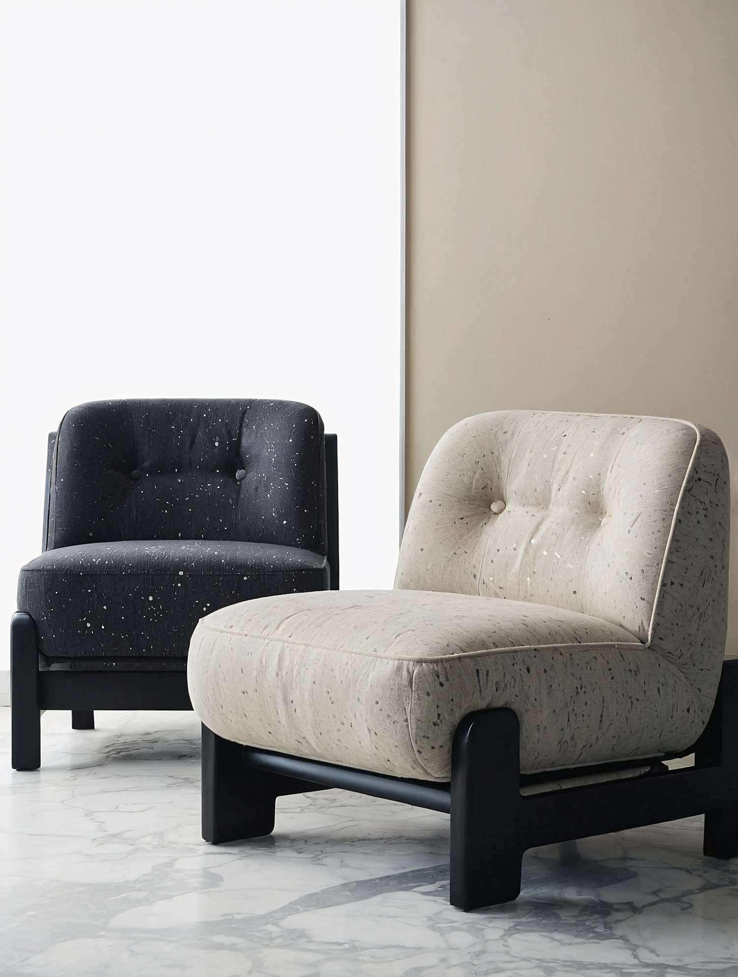 Modern beige and charcoal speckled lounge chairs with tufted backs on a marble floor, set against a neutral minimalist background.