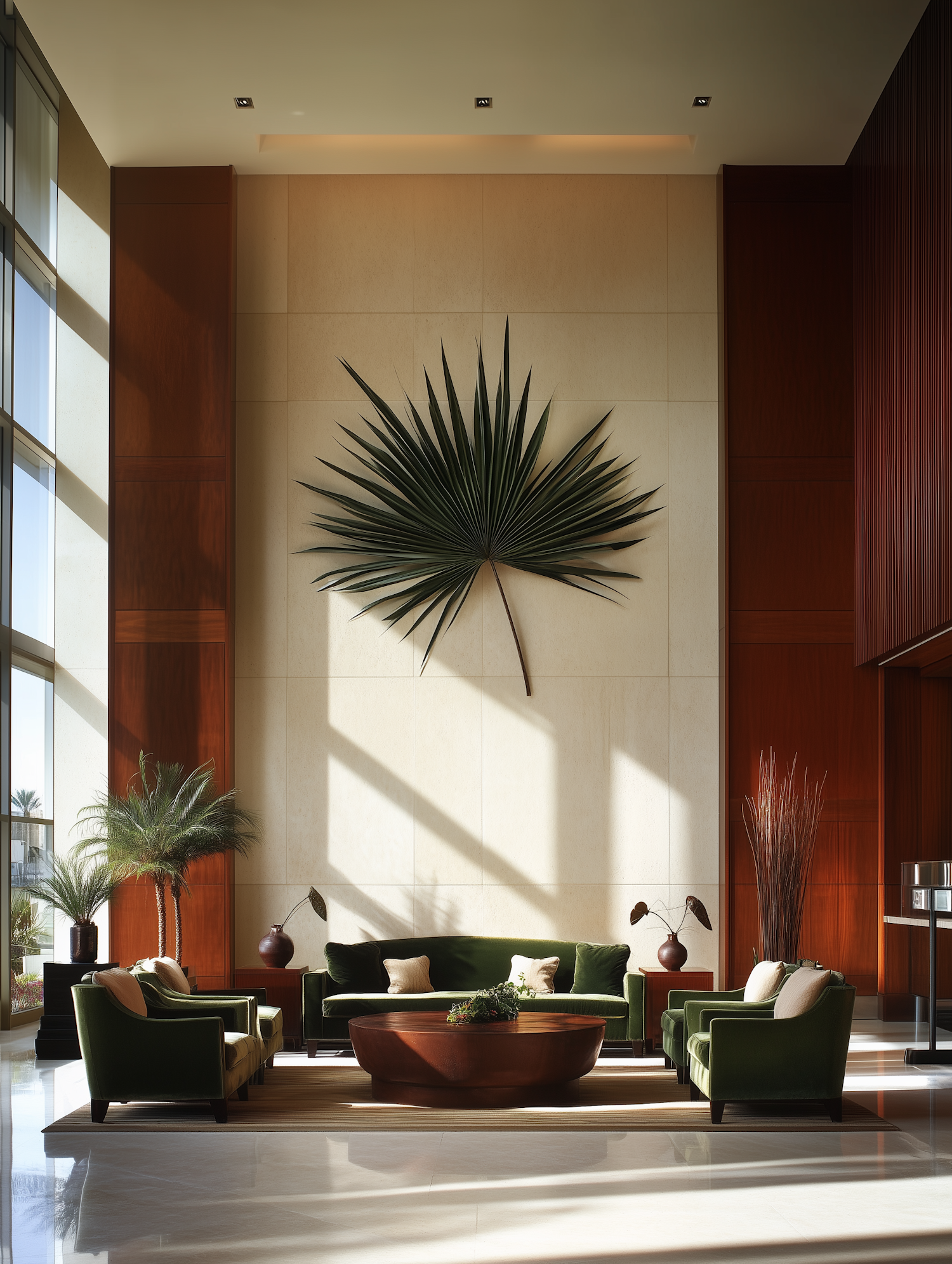 Modern lounge with green velvet seating, palm decor, and natural light. Perfect mix of luxury and nature-inspired design.