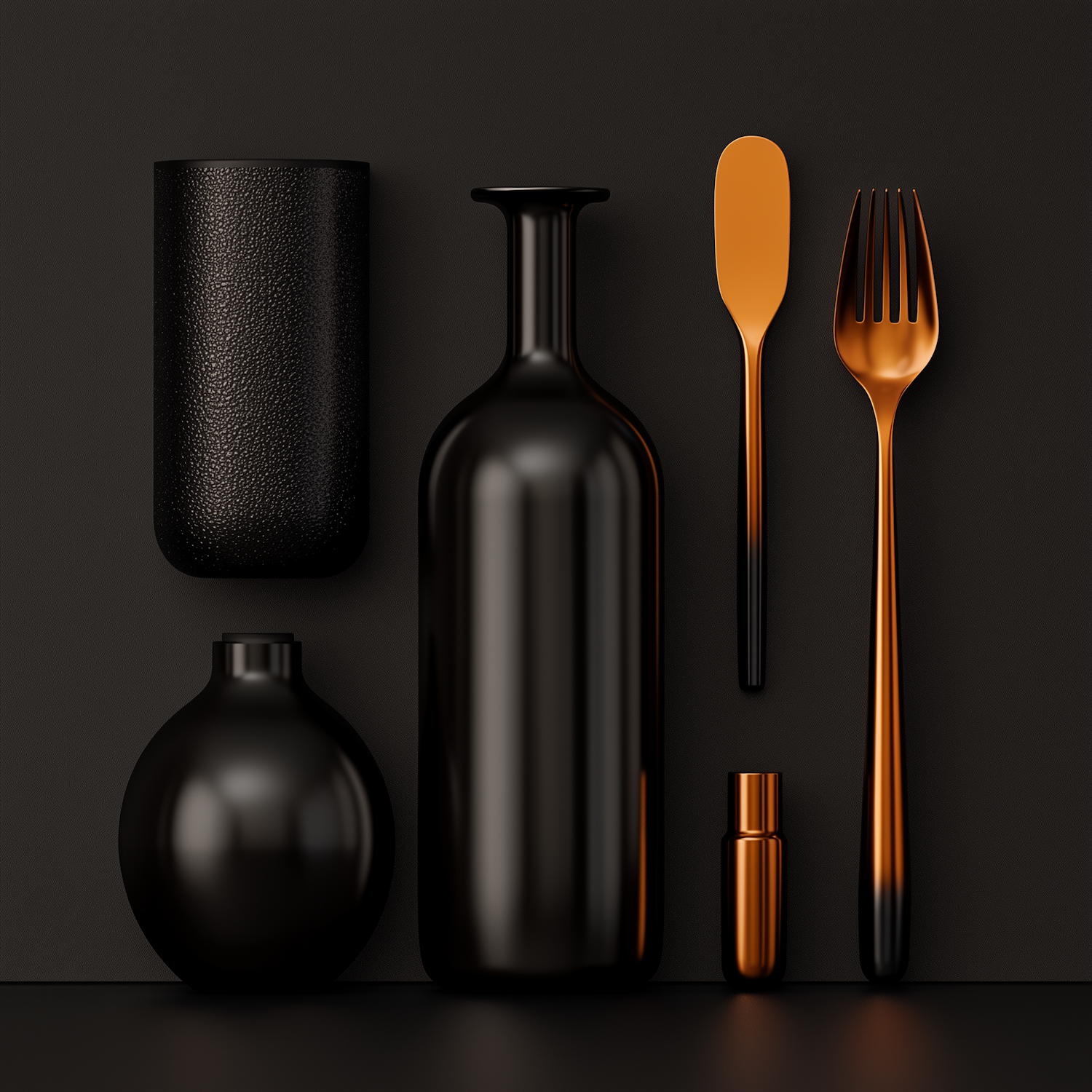 Sleek black and gold kitchenware set with a modern design, featuring a bottle, cup, and utensils against a dark background.